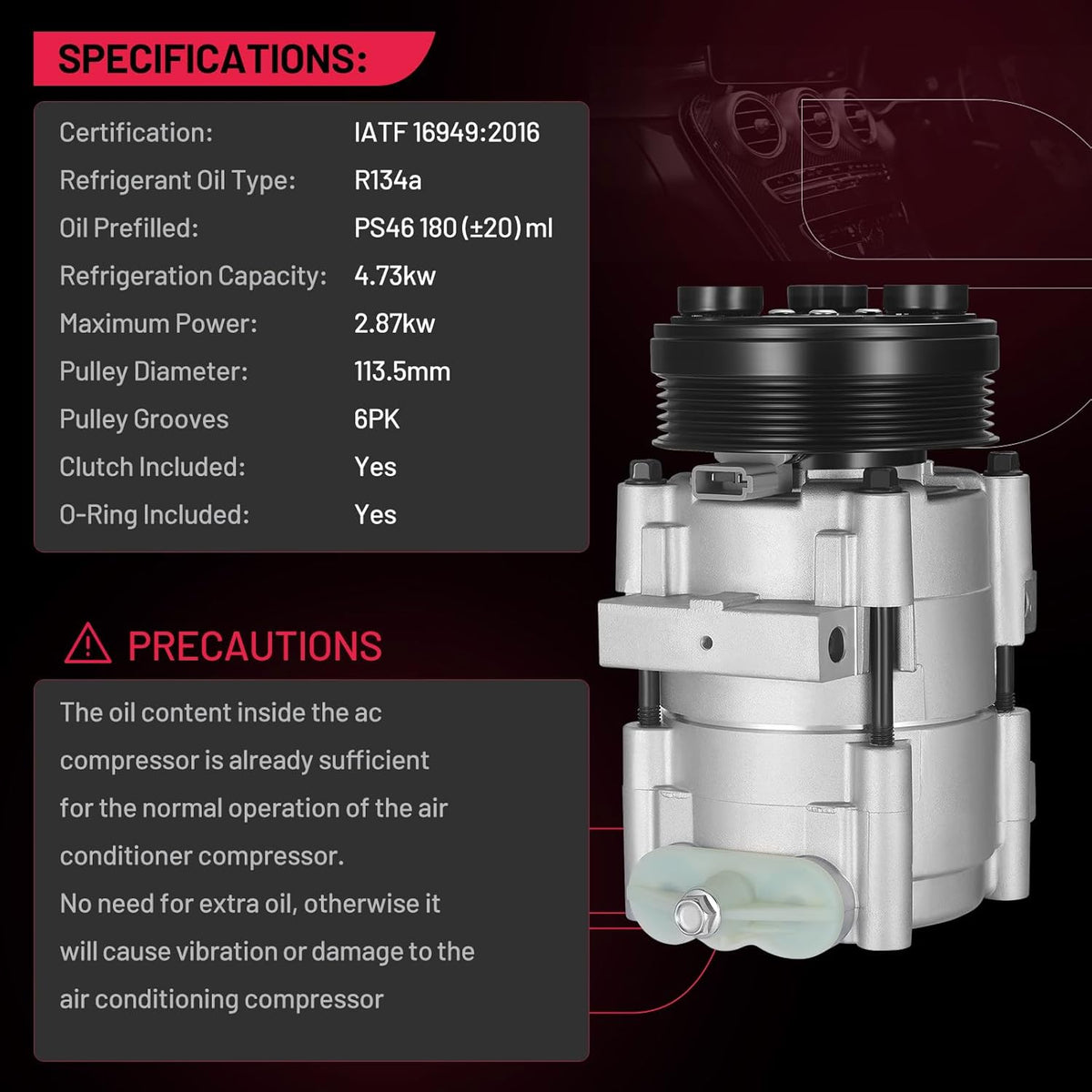 Vehicle Fitment - The AC compressor compatible with 2006 Ford F-150 V8 5.4L, 2004-2006 Ford F-150 V8 5.4L, 2004 Ford F-150 Heritage V8 4.6L 5.4L, 2005-2007 Ford F-250 Super Duty V8 5.4L, 2005-2007 Ford F-250 Super Duty V10 6.8L, 2007 Ford F-350 V8 5.4L, 1994-1995 Ford Cougar V8 4.6L, 1993-2002 Ford Crown Victoria V8 4.6L, 2002-2005 Ford Excursion V8 5.4L 6.0L, 2003-2005 Ford Excursion V8 6.0L, 2002-2005 Ford Excursion V10 6.8L, 2005-2006 Ford F-150 V8 4.6L