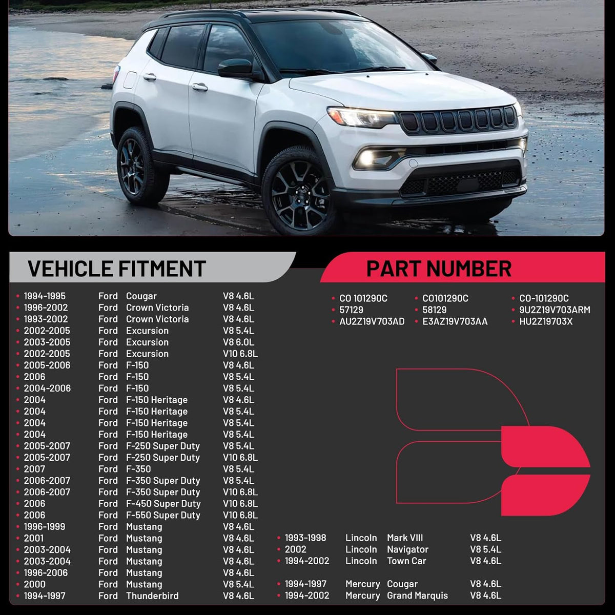 Part Number -Replace CO 101290C、CO101290C、CO-101290C、57129、58129、9U2Z19V703ARM、AU2Z19V703AD、 E3AZ19V703AA、HU2Z19703X. compatible with 06-07 Ford F-350 Super Duty V8 5.4L/V10 6.8L, 2006 Ford F-450/F-550 Super Duty V10 6.8L, 1996-2006 Ford Mustang V8 4.6L, 2000 Ford Mustang V8 5.4L, 1994-1997 Ford Thunderbird V8 4.6L, 1993-1998 Lincoln Mark VIII V8 4.6L, 2002 Lincoln Navigator V8 5.4L, 1994-2002 Lincoln Town Car V8 4.6L, 1994-1997 Mercury Cougar V8 4.6L, 1994-2002 Mercury Grand Marquis V8 4.6L