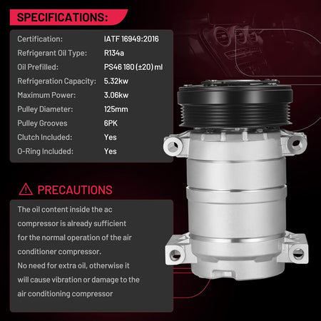 Easy Installation - The Air Conditioning A/C Compressors come pre-charged with PAG oil for R134a applications, come with the R134A required o-rings /sealing washers and direct fit connectors for ease of installation
