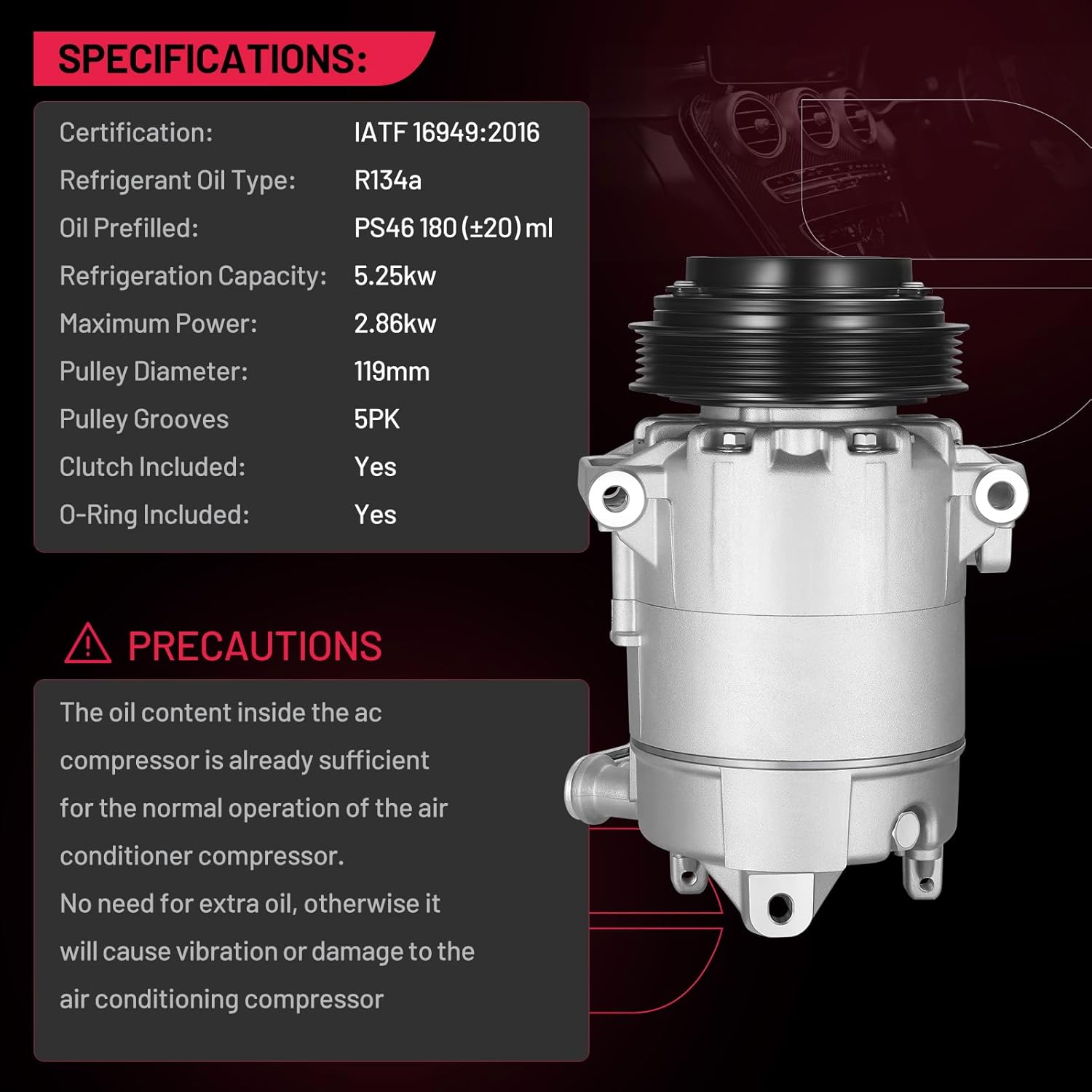 Vehicle Fitment - The AC compressor compatible with 2014-2017 Buick Regal L4 2.0L, 2015-2016 Buick Regal L4 2.4L, 2015-2017 GMC Terrain L4 2.4L, 2013-2016 Chevrolet Malibu L4 2.0L, 2016 Chevy Malibu Limited L4 2.5L, 2014-2015 Chevy Impala L4 2.5L, 2019 Chevy Impala L4 2.5L, 2013-2015 Chevy Malibu L4 2.5L, 2016-2017 Chevy Equinox L4 2.4L