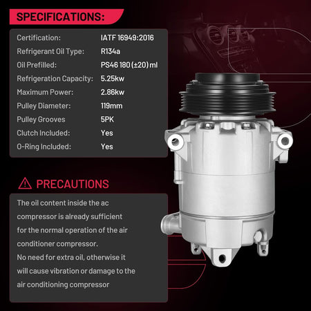 Easy Installation - The Air Conditioning A/C Compressors come pre-charged with PAG oil for R134a applications, come with the R134A required o-rings /sealing washers and direct fit connectors for ease of installation