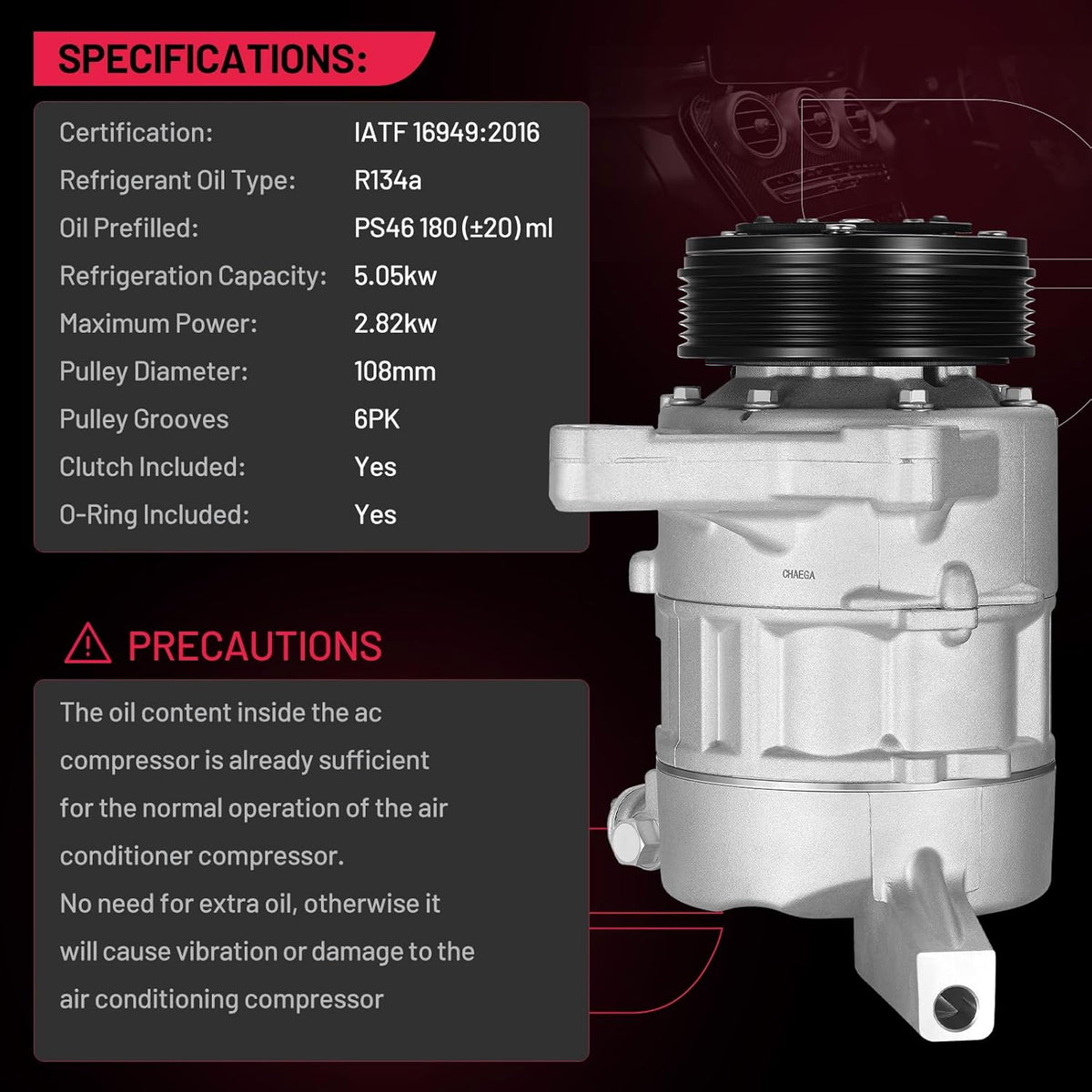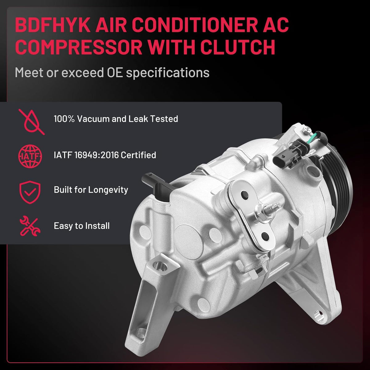 Superior Quality - The A/C Compressors for car are built in a IATF 16949:2016 Certified facility, meet or exceed OE specifications. Mechanically tested prior to leaving the factory ensures optimal performance and enhanced durability. Great life cycles.
