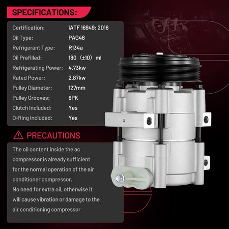 Superior Quality - The A/C Compressors for car are built in a IATF 16949:2016 Certified facility, meet or exceed OE specifications. Mechanically tested prior to leaving the factory ensures optimal performance and enhanced durability. Great life cycles.