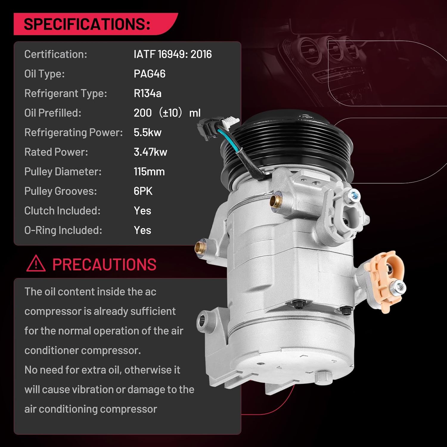 Superior Quality - The A/C Compressors for car are built in a IATF 16949:2016 Certified facility, meet or exceed OE specifications. Mechanically tested prior to leaving the factory ensures optimal performance and enhanced durability. Great life cycles.