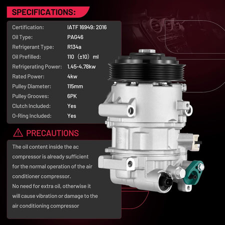 Superior Quality - The A/C Compressors for car are built in a IATF 16949:2016 Certified facility, meet or exceed OE specifications. Mechanically tested prior to leaving the factory ensures optimal performance and enhanced durability. Great life cycles.