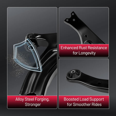 【Control Arm Features】The control arm improves stability, handling, and driving comfort, with a protective finish that helps extend service life. Made from forged alloy steel, it delivers reliable performance, reduces noise, and ensures accurate fitment for safe and consistent driving