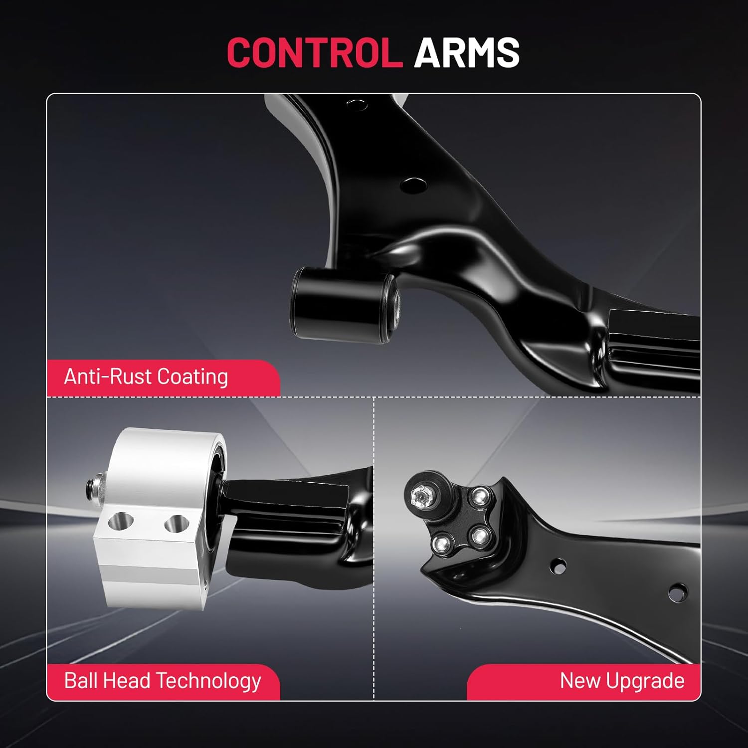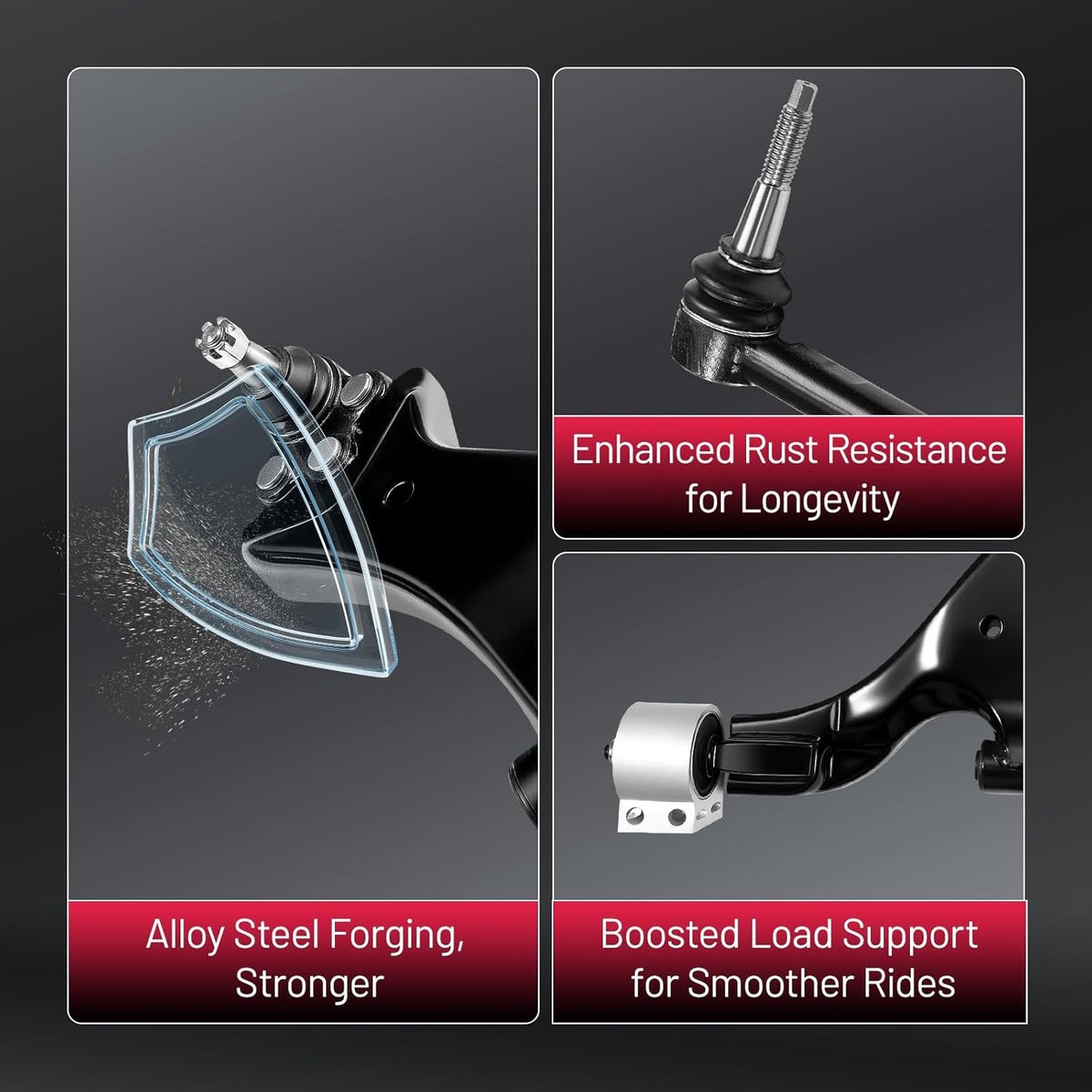 【Control Arm Features】The control arm improves stability, handling, and driving comfort, with a protective finish that helps extend service life. Made from forged alloy steel, it delivers reliable performance, reduces noise, and ensures accurate fitment for safe and consistent driving
