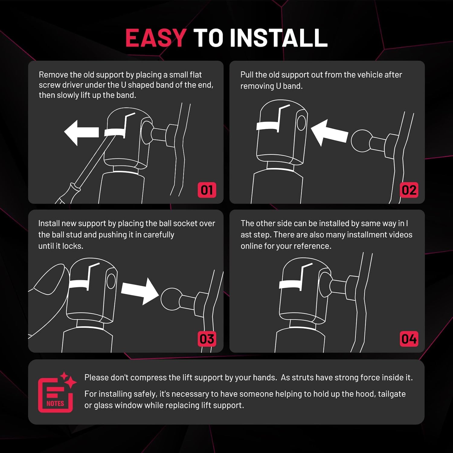 【Worry about Easy-use? 】BDFHYK gas struts are very easy to install. You can install it only by yourself with a flat screwdriver. We prepared online instructions for your reference anytime and anywhere. It's also very convenient after installation and almost like your original one. It's very soft during use.