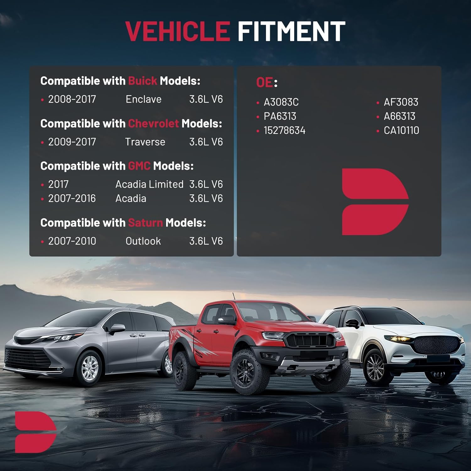 【COMPATIBILITY】Compatible with GMC Models: 2017 Acadia Limited 3.6L V6, 2007-2016 Acadia 3.6L V6; Compatible with Buick Models: 2008-2017 Enclave 3.6L V6; Compatible with Chevy 2009-2017 Traverse 3.6L V6; Compatible with Saturn Models: 2007-2010 Outlook 3.6L V6