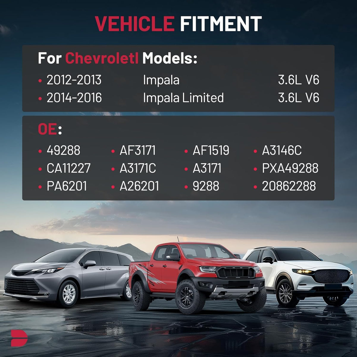 【COMPATIBILITY】Compatible with Chevrolet Impala 2012-2013 V6 3.6L; Compatible with Chevrolet Impala Limited 2014-2016 V6 3.6L.