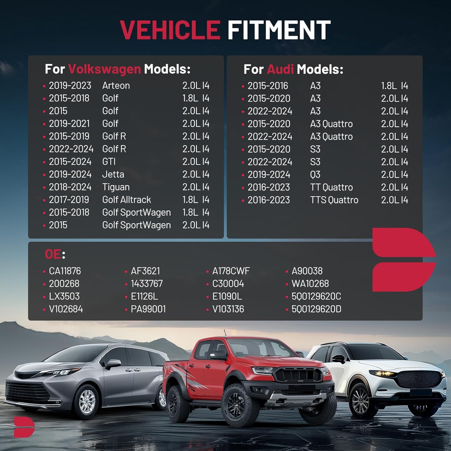 【COMPATIBILITY】Compatible with Audi A3 2015-2020 2022-2023, A3 Quattro 2015-2020 2022-2024, Q3 2019-2024, S3 2015-2020 2022-2024, TT Quattro 2016-2023, TTS Quattro 2016-2023; Compatible with Volkswagen Arteon 2019-2023, Golf 2015-2018, Golf Alltrack 2017-2019, Golf R 2015-2019 2022, Golf SportWagen 2015-2018, GTI 2015-2024.