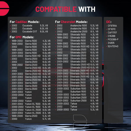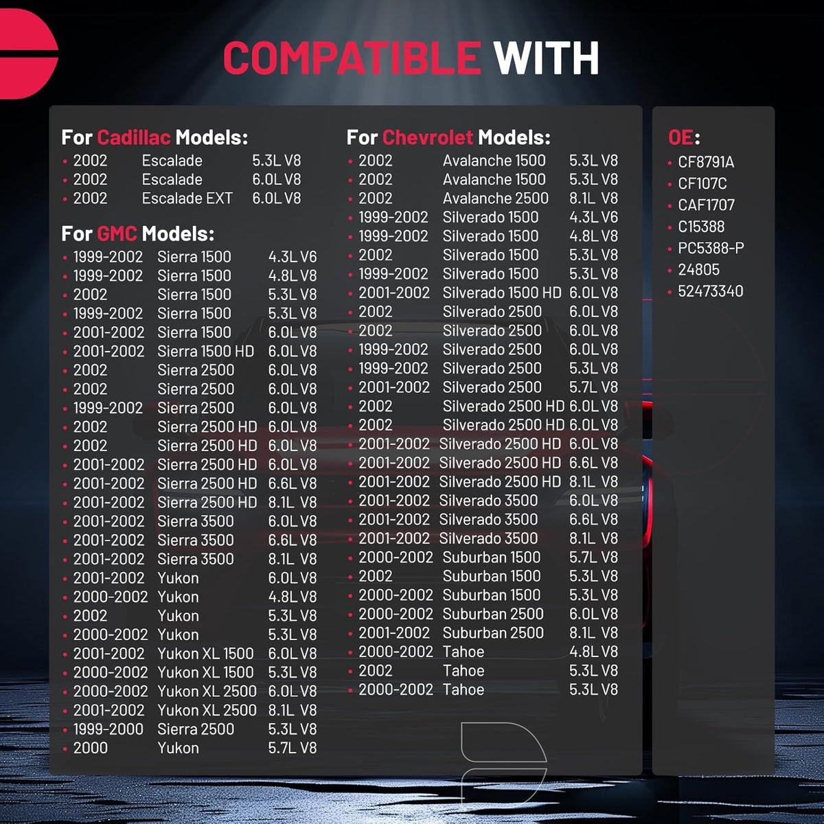 [Vehicle Fitment] Compatible with Cadillac Escalade/Escalade EXT 2002; Compatible with Chevry Avalanche 1500/2500/ Silverado 2500 HD 2002, Silverado 1500/2500 1999-2002, Silverado 1500 HD/2500 HD 2001-2002, Silverado 3500 2001-2002, Suburban 1500/2500/ Tahoe 2000-2002; Compatible with GMC Sierra 1500/2500 1999-2002, Sierra 1500 HD/2500 HD/3500/ 2001-2002, Yukon/Yukon XL 1500/2500 2000-2002