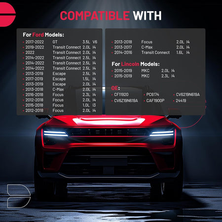 [Vehicle Fitment] Compatible with Ford GT 2017-2022 3.5L V6, Transit Connect 2019-2022 2.0L l4, Transit Connect 2014-2022 2.5L l4, Transit Connect 2014-2016 1.6L l4, Escape 2013-2019 2.0L/2.5L l4, Escape 2017-2019 1.5L l4, C-Max 2013-2018 2.0L l4, Focus 2016-2018 2.3L l4, Focus 2012-2018 2.0L l4, Focus 2015-2018 1.0L l3; Compatible with Lincoln MKC 2015-2019 2.0L/2.3L l4