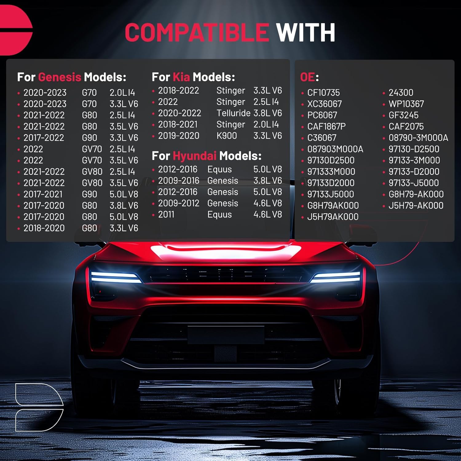[Vehicle Fitment] Compatible with Genesis G70 2020-2023, G80/G90 2017-2022, GV70 2022, GV80 2021-2022; Compatible with Hyundai Santa Fe 2019-2020, Equus 2011-2016, Genesis 2009-2016; Compatible with Kia Stinger 2018-2022, Telluride 2020-2022, Stinger 2018-2021, K900 2019-2020