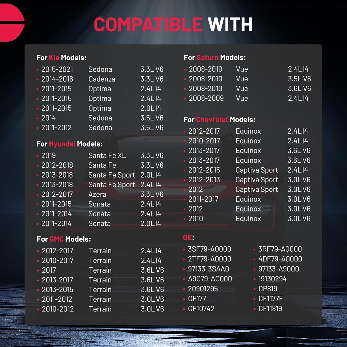 [Vehicle Fitment] Compatible with Kia Sedona 2011-2012 & 2014-2021, Cadenza 2014-2016, Optima 2011-2015; Compatible with Hyundai Santa Fe 2012-2018, Santa Fe XL 2019, Santa Fe Sport 2013-2018, Azera 2012-2017, Sonata 2011-2015; Compatible with Chevy Equinox 2010-2017, Captiva Sport 2012-2015; Compatible with GMC Terrain 2010-2017; Compatible with Saturn Vue 2008-2010