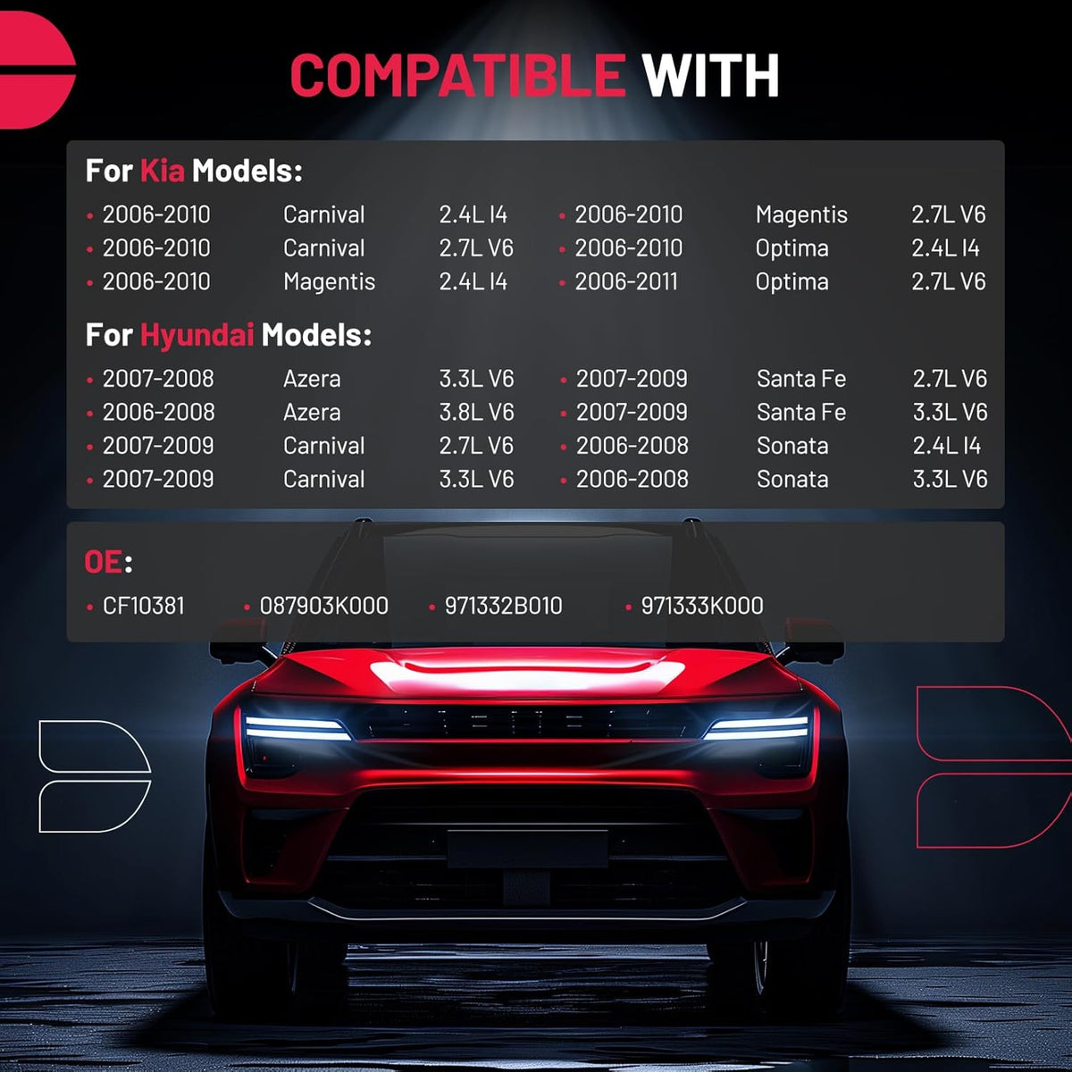 【Fitment Vehicles】Compatible with Kia Models: 2006-2010 Carnival 2.4L l4 & 2.7L V6, 2006-2010 Magentis 2.4L l4 & 2.7L V6, 2006-2010 Optima 2.4L l4, 2006-2011 Optima 2.7L V6; Compatible with Hyundai Models: 2007-2008 Azera 3.3L V6, 2006-2008 Azera 3.8L V6, 2007-2009 Carnival 2.7L V6 & 3.3L V6, 2007-2009 Santa Fe 2.7L V6 & 3.3L V6, 2006-2008 Sonata 2.4L l4 & 3.3L V6