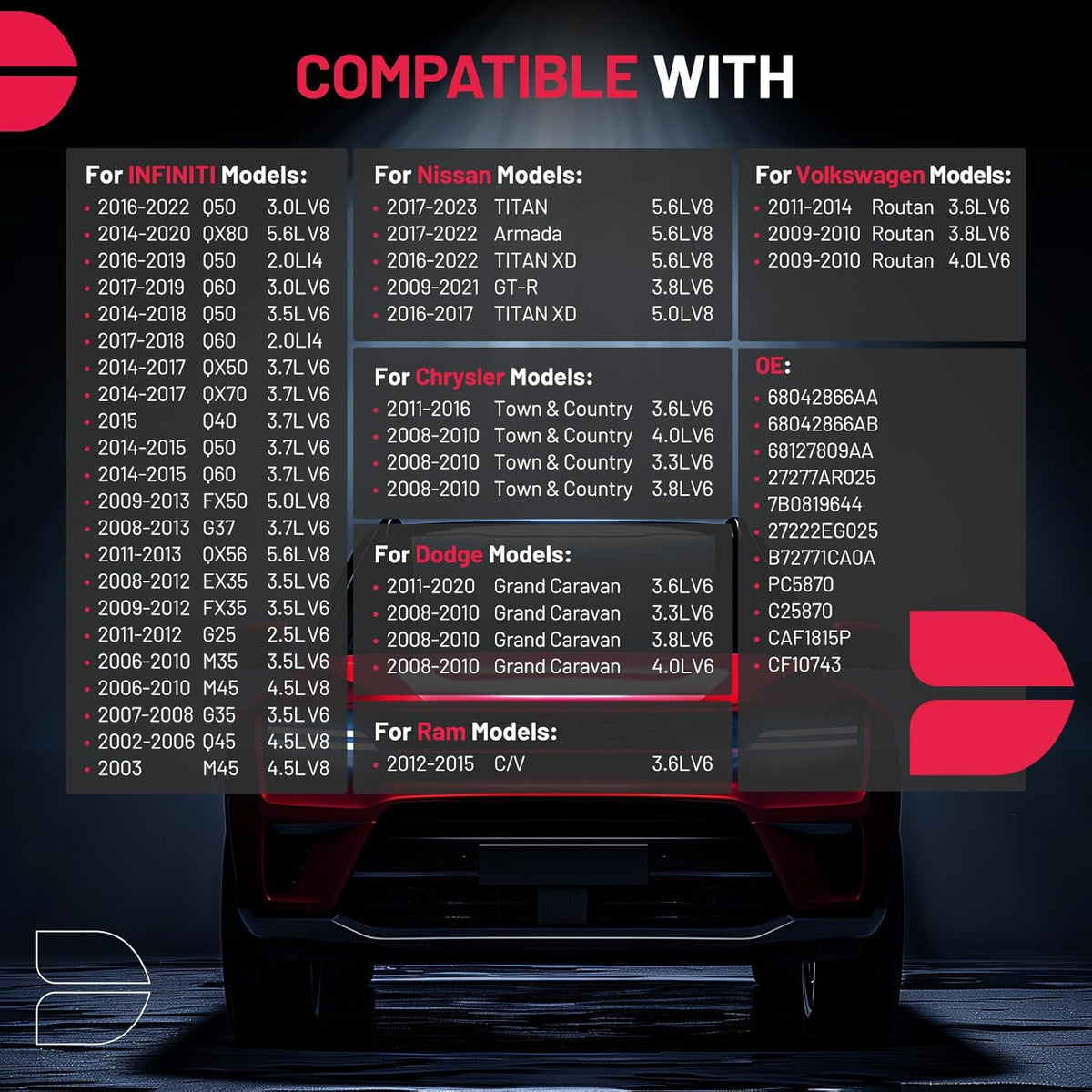 【Fitment】Compatible with Nissan Models: 2017-2023 TITAN, 2017-2022 Armada, 2016-2022 TITAN XD, 2009-2021 GT-R, 2016-2017 TITAN XD; Compatible with INFINITI Models: 2014-2022 Q50, 2014-2020 QX80, 2014-2015 & 2017-2019 Q60, 2014-2017 QX50/ QX70, 2015 Q40, 2009-2013 FX50, 2008-2013 G37, 2011-2013 QX56, 2008-2012 EX35, 2011-2012 G25, 2006-2010 M35, 2003 & 2006-2010 M45, 2007-2008 G35, 2002-2006 Q45; Compatible with Chrysler Models: 2008-2016 Town & Country; Compatible with Dodge Models: 2008-2020 Grand Caravan; Compatible with Volkswagen Models: 2009-2014 Routan; Compatible with Ram C/V 2012-2015