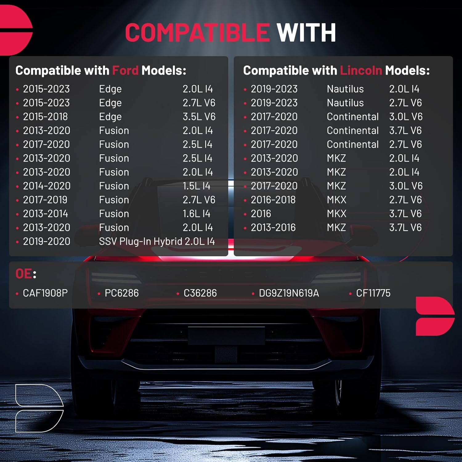 [Vehicle Fitment] Compatible with Lincoln Models: 2017-2020 Continental 2.7L/3.0L/3.7L V6, 2016-2018 MKX 2.7L V6, 2016 MKX 3.7L V6, 2013-2020 MKZ 2.0L l4, 2017-2020 MKZ 3.0L V6, 2013-2016 MKZ 3.7L V6, 2019-2023 Nautilus 2.0L l4/ 2.7L V6; Compatible with Ford Models: 2015-2023 Edge 2.0L l4/ 2.7L V6, 2015-2018 Edge 3.5L V6, 2013-2020 Fusion 2.0L/2.5L l4, 2013-2014 Fusion 1.6L l4, 2014-2020 Fusion 1.5L l4, 2017-2019 Fusion 2.7L V6, 2017-2020 Fusion 2.5L l4, 2019-2020 SSV Plug-In Hybrid 2.0L l4