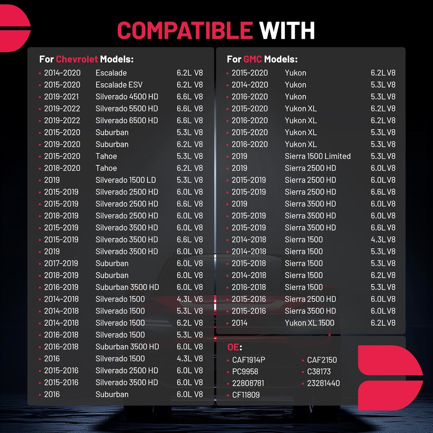 【Replaces Part】 CAF1914P, CAF2150, PC9958, C38173, 22808781, 23281440, CF11809. Compatible with Cadillac Models: 2014-2020 Escalade 6.2L V8, 2015-2020 Escalade ESV 6.2L V8
