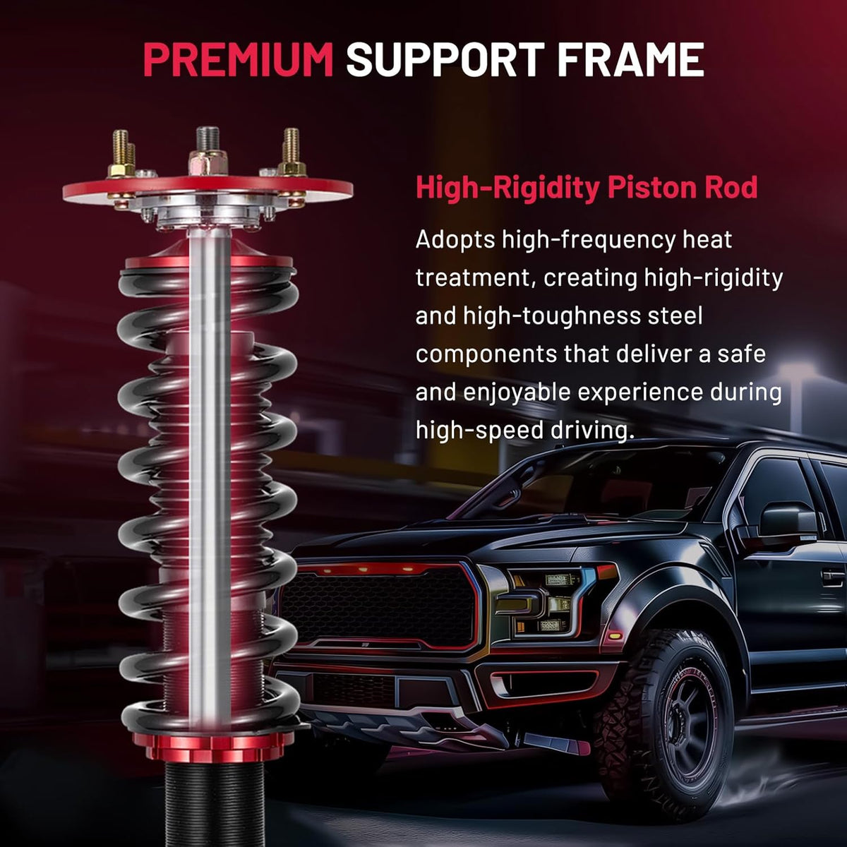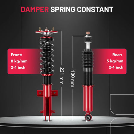 【Height Adjustable】: The lowering height ranges from 2 to 4 inches, with adjustable spring and shock absorber brackets that enable drivers to easily customize the vehicle's suspension height. Front Spring Rate: 8kg/mm; Rear Spring Rate: 5kg/mm