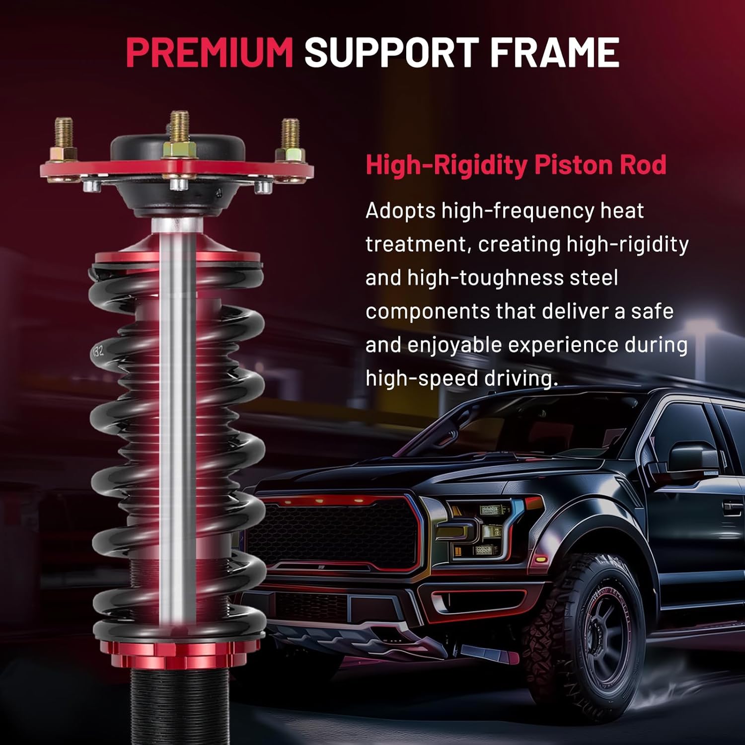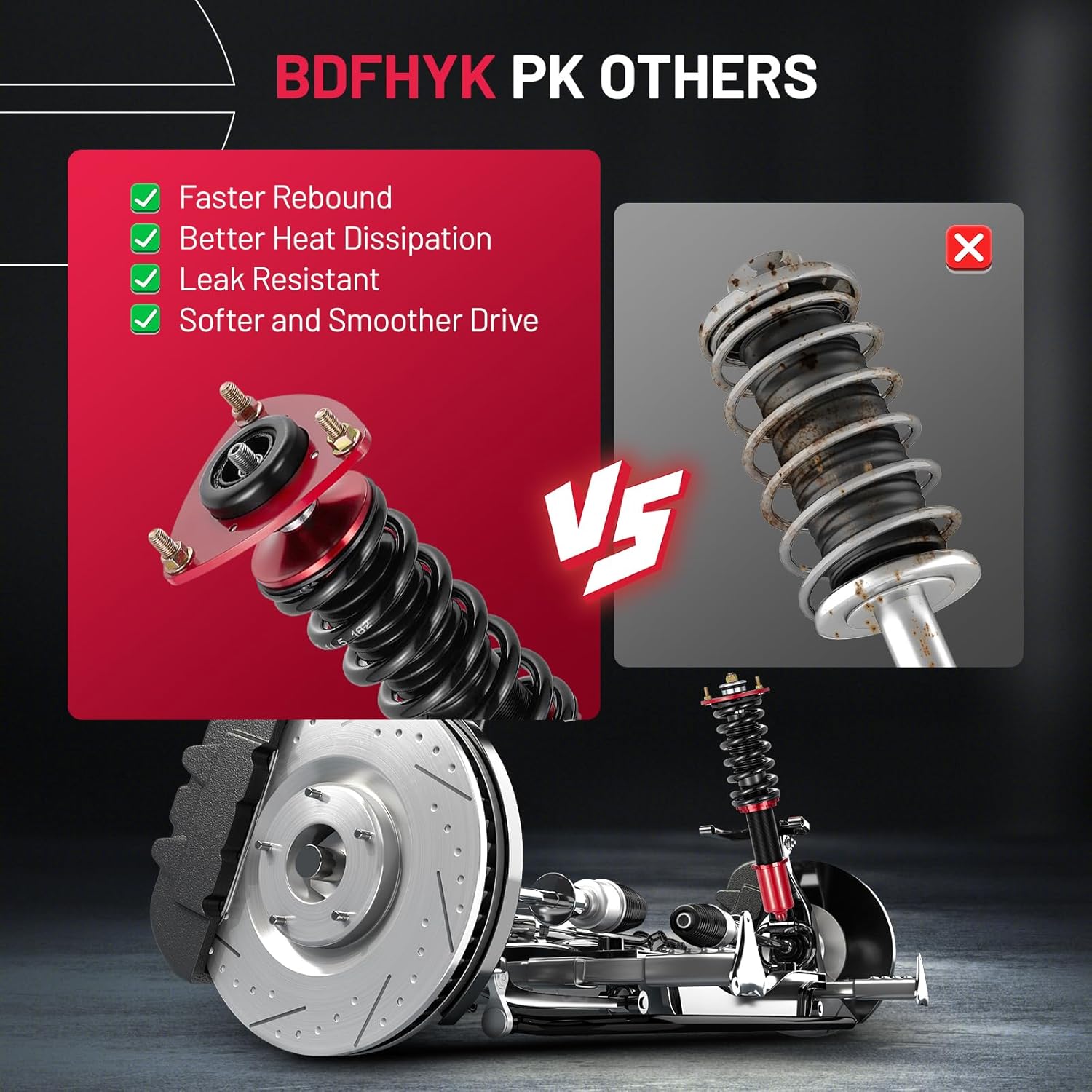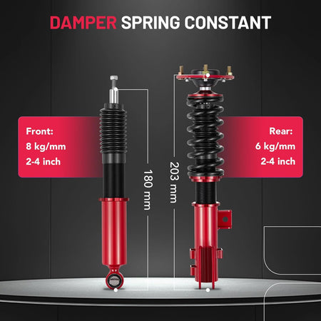 【Height Adjustable】: The lowering height ranges from 2 to 4 inches, with adjustable spring and shock absorber brackets that enable drivers to easily customize the vehicle's suspension height. Front Spring Rate: 8kg/mm; Rear Spring Rate: 6kg/mm