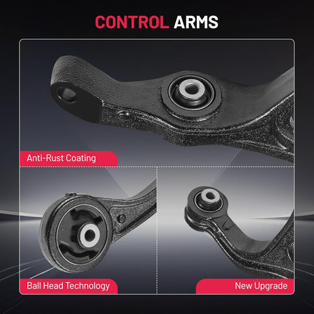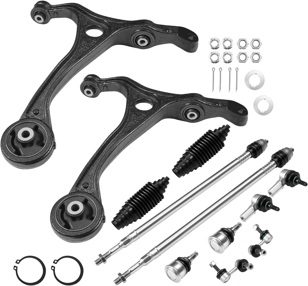 【Products contain】1x Front Lower Control Arm - Passenger Side - K640399,1x Front Lower Control Arm - Driver Side - K640400,2x Front Lower Ball Joints - Driver and Passenger Side - K80223,1x Front Sway Bar End Link - Driver Side - K90454,1x Front Sway Bar End Link - Passenger Side - K90455,2x Front Outer Tie Rod Ends - Driver and Passenger Side - ES3581,2x Inner Tie Rod Ends - Driver and Passenger Side - EV80383,2x Tie Rod Boots + Bellows w/Locking C-Clamps