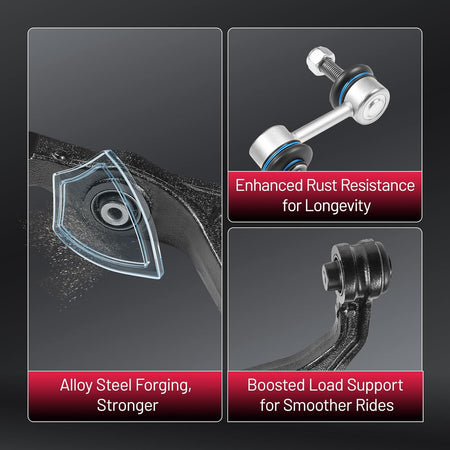 【Control Arm Features】The control arm improves stability, handling, and driving comfort, with a protective finish that helps extend service life. Made from forged alloy steel, it delivers reliable performance, reduces noise, and ensures accurate fitment for safe and consistent driving