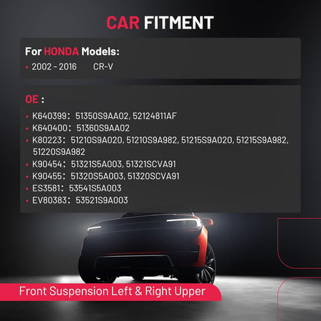 【Replace OE】 K640399:51350S9AA02, 52124811AF K640400:51360S9AA02 K80223:51210S9A020, 51210S9A982, 51215S9A020, 51215S9A982, 51220S9A982 K90454:51321S5A003, 51321SCVA91 K90455:51320S5A003, 51320SCVA91 ES3581:53541S5A003 EV80383:53521S9A003