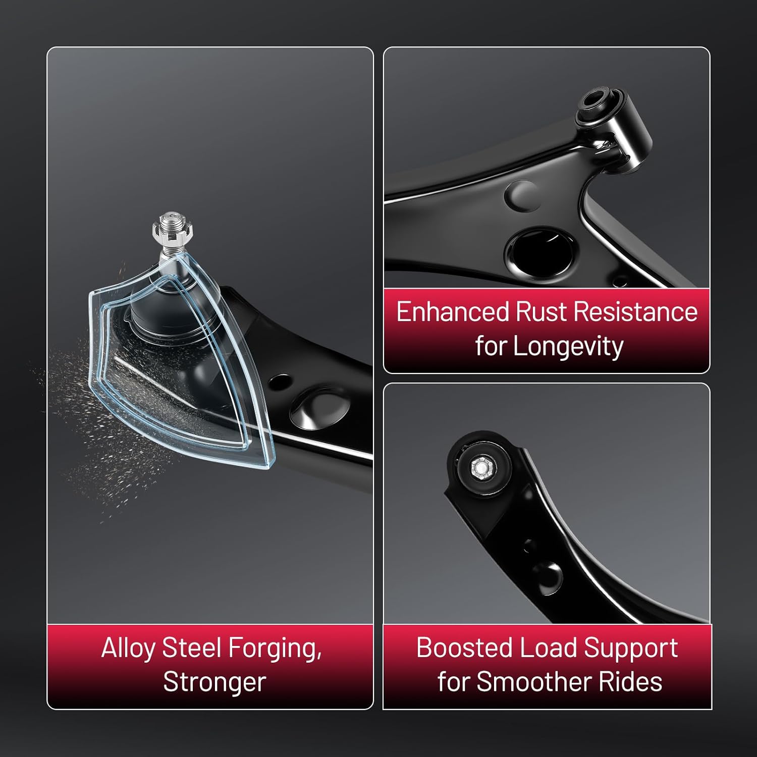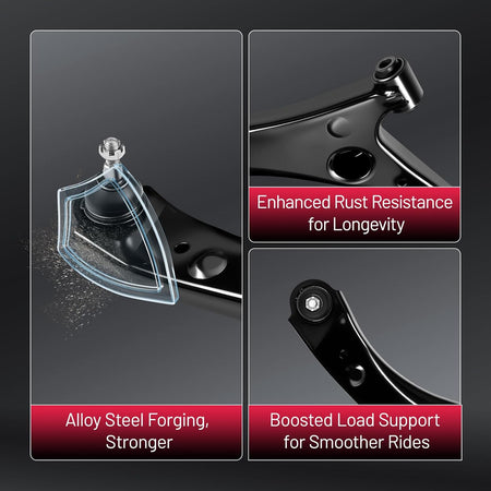 【Control Arm Features】The control arm improves stability, handling, and driving comfort, with a protective finish that helps extend service life. Made from forged alloy steel, it delivers reliable performance, reduces noise, and ensures accurate fitment for safe and consistent driving