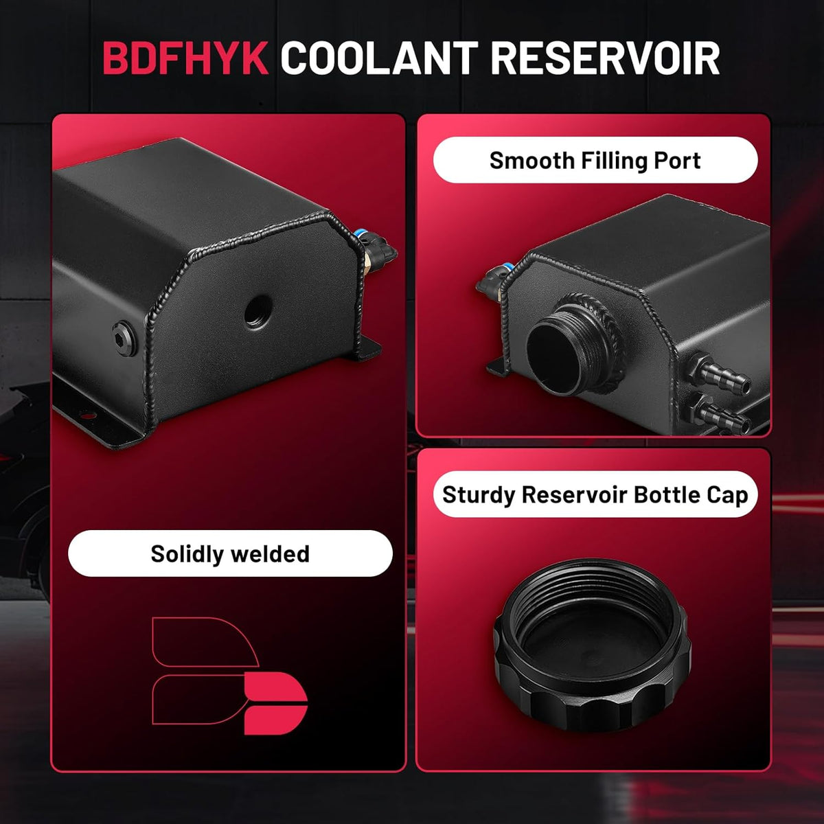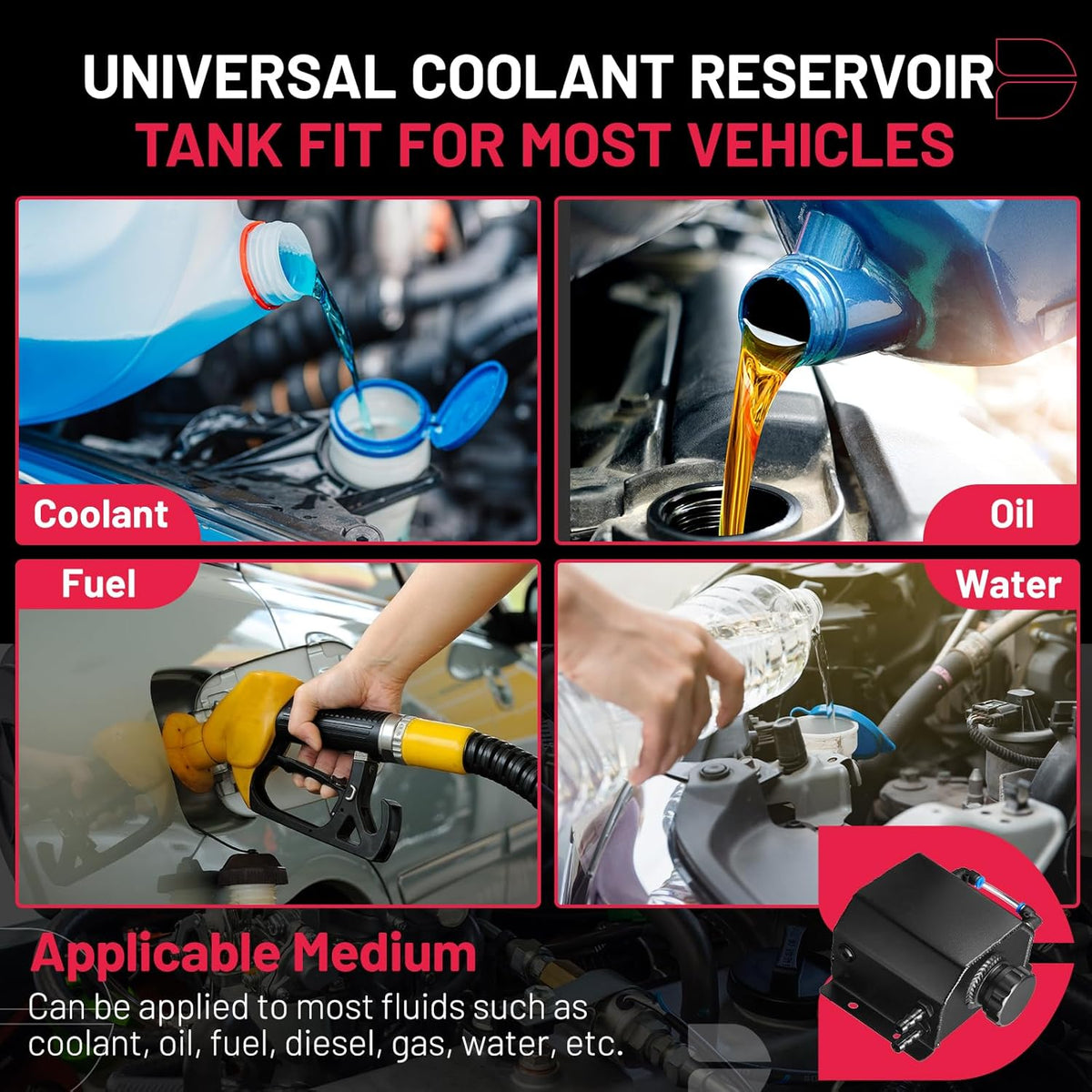 【UNIVERSAL OVERFLOW TANK】Coolant overflow tank made of 6061 aluminum for enhanced strength, anodized polished and durable, better than plastic material.Radiator coolant overflow tank tight closed cap, fully Tig welded and thread come with O-ring gasket, keep a good closed environment and prevent coolant leakage.