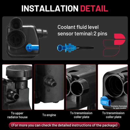 【Function】Coolant reservoirs use safe and high-quality ABS plastic materials that can withstand excessive heat and vibration. Helping to reduce oil dilution, cylinder bore wear, fuel consumption, exhaust emission, and improving the efficiency of the heating system.