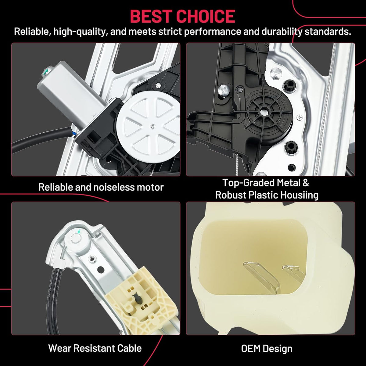 【Premium Quality】 This window regulator and motor assembly feature significant enhancements over the factory part, providing a higher level of reliability. It incorporates tension springs to effectively resist cable reel binding caused by prolonged use. Additionally, it is equipped with advanced cable guides to eliminate high cable tension and reduce cable stress.
