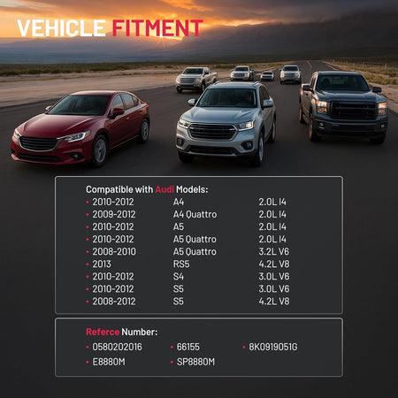 【Compatible with】Compatible with Audi A4 2010-2012 2.0L L4, A4 Quattro 2009-2012 2.0L L4; Compatible with Audi A5 2010-2012 2.0L L4, A5 Quattro 2010-2012 2.0L L4, A5 Quattro 2008-2010 3.2L V6; Compatible with Audi RS5 2013 4.2L V8; Compatible with Audi S4 2010-2012 3.0L V6, Audi S5 2010-2012 3.0L V6, Audi S5 2008-2012 4.2L V8
