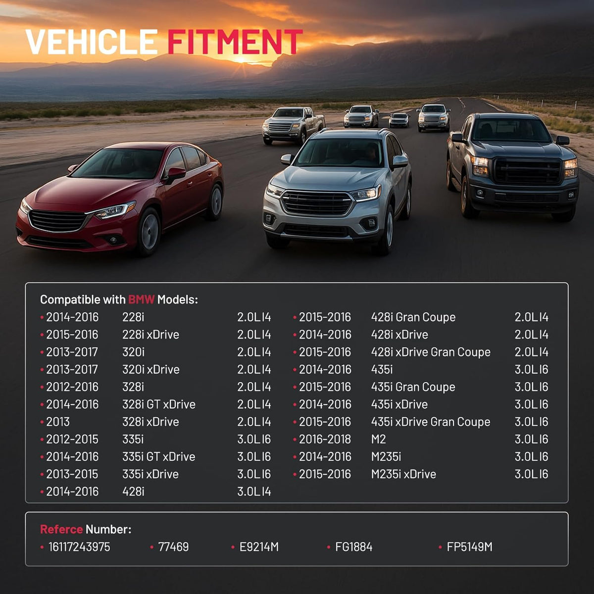 【Compatible with】Compatible with BMW 328i xDrive 2013; 335i 2012-2015; 328i 2012-2016; 335i xDrive 2013-2015; 320i, 320i xDrive 2013-2017; 228i, 328i GT xDrive, 335i GT xDrive, 428i, 428i xDrive, 435i, 435i xDrive, M235i 2014-2016; 228i xDrive, 428i Gran Coupe, 428i xDrive Gran Coupe, 435i Gran Coupe, 435i xDrive Gran Coupe, M235i xDrive 2015-2016; M2 2016-2018; 2.0L L4, 3.0L L6