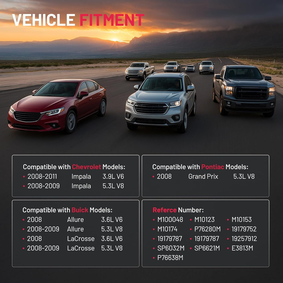 【Compatible with】Compatible with Buick Allure 2008 3.6L V6, Compatible with Buick Allure 2008-2009 5.3L V8, Compatible with Buick LaCrosse 2008 3.6L V6, Compatible with Buick LaCrosse 2008-2009 5.3L V8, Compatible with Chevrolet Impala 2008-2011 3.9L V6, Compatible with Chevrolet Impala 2008-2009 5.3L V8, Compatible with Pontiac Grand Prix 2008 5.3L V8