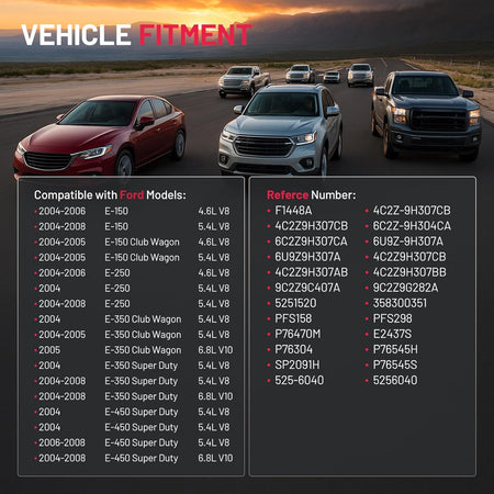 【Compatible with】Compatible with Ford E-150 2004-2006 4.6L V8, Compatible with Ford E-150 2004-2008 5.4L V8, Compatible with Ford E-150 Club Wagon 2004-2005 4.6L 5.4L V8, Compatible with Ford E-250 2004-2008 4.6L 5.4L V8, Compatible with Ford E-350 Club Wagon 2004-2005 5.4L V8, Compatible with Ford E-350 Club Wagon 2005 6.8L V10, Compatible with Ford E-350 Super Duty 2004-2008 5.4L V8 6.8L V10, Compatible with Ford E-450 Super Duty 2004-2008 5.4L V8 6.8L V10