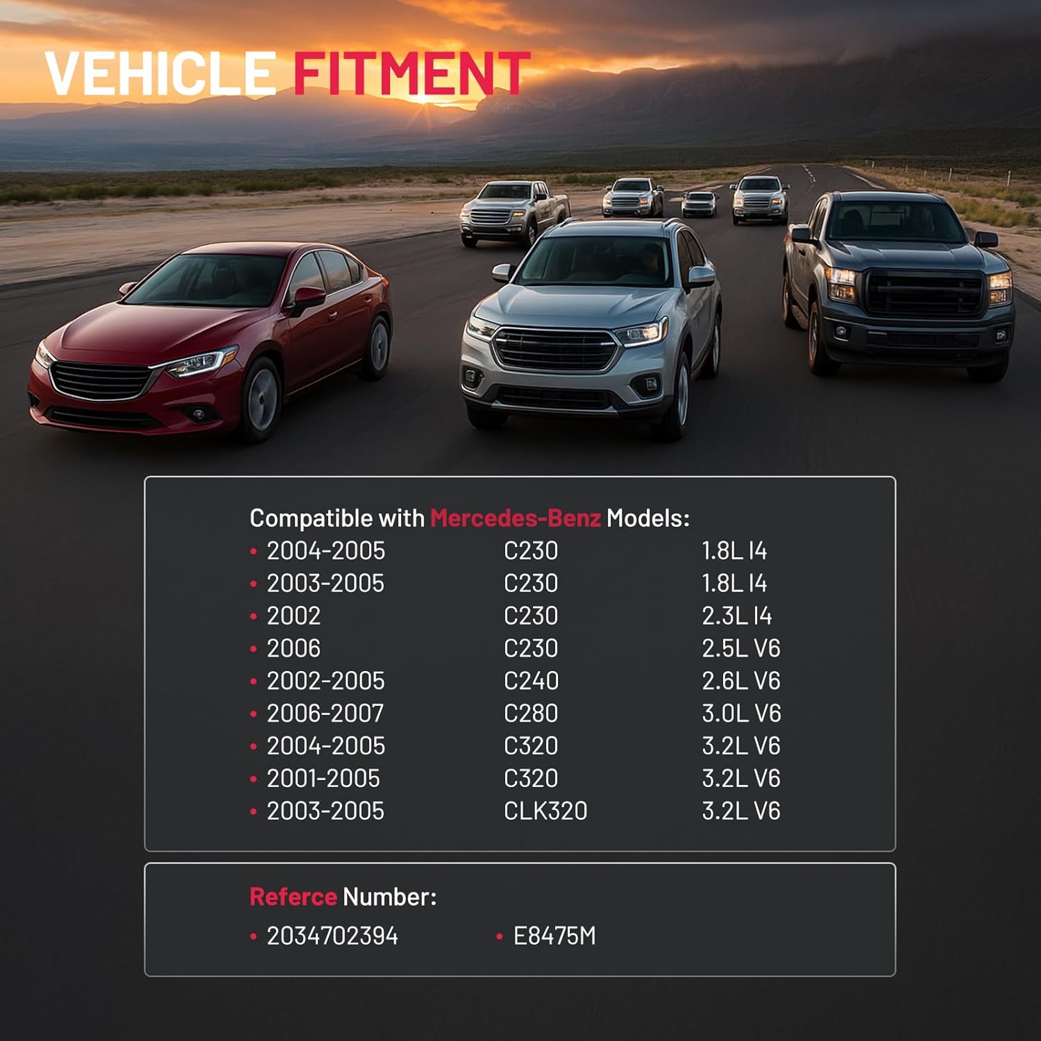 【Compatible with】Compatible with Mercedes-Benz C230 2002 2.3L L4; 2003-2005 1.8L L4; 2006 2.5L V6; Compatible with Mercedes-Benz C240 2002-2005 2.6L V6; Compatible with Mercedes-Benz C280 2006-2007 3.0L V6; Compatible with Mercedes-Benz C320 2001-2005 3.2L V6; Compatible with Mercedes-Benz CLK320 2003-2005 3.2L V6