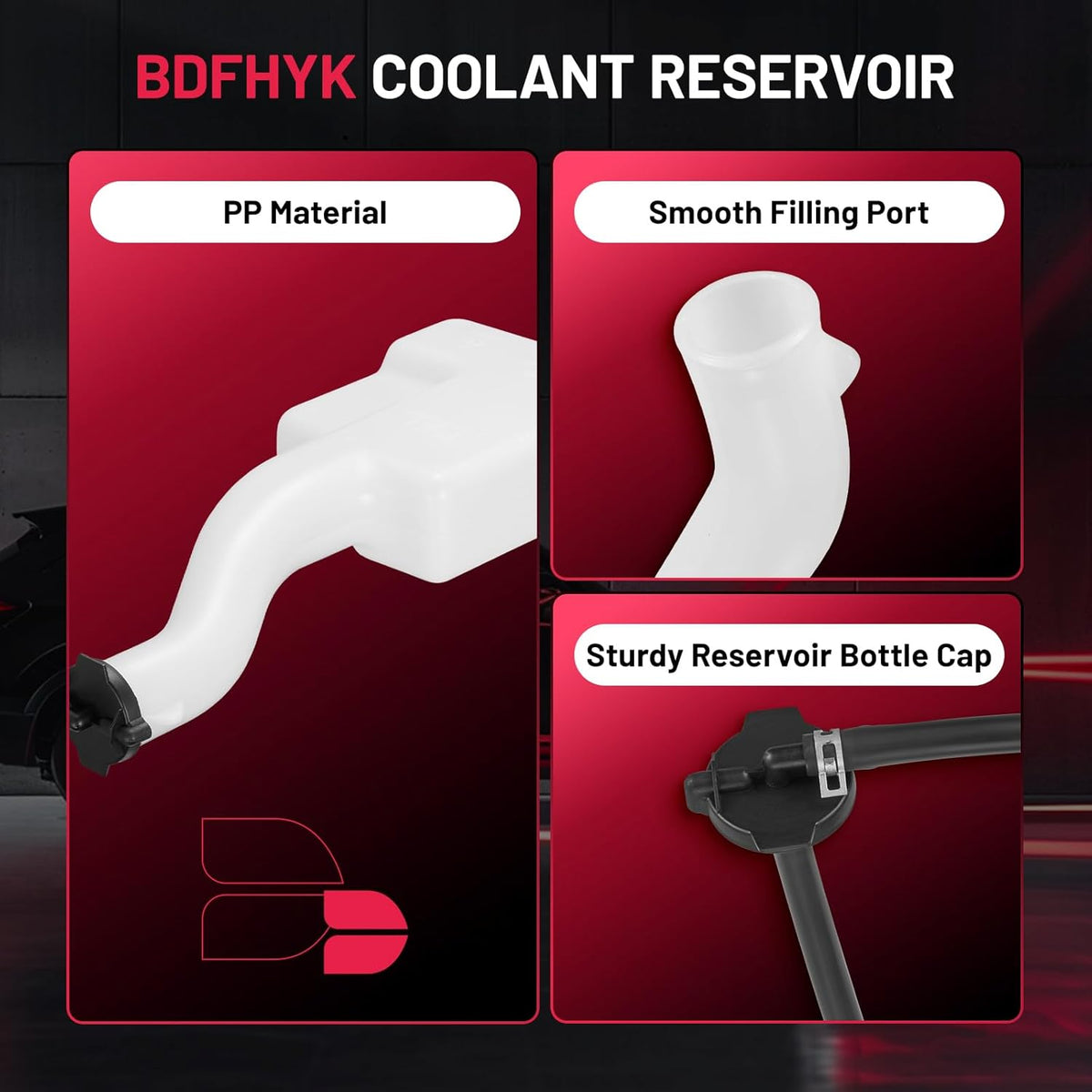 【Coolant Reservoir Features】This coolant overflow tank is made of high quality PP material, which helps to reduce oil dilution, fuel consumption, prevent oil leakage and reduce the pressure of car cooling system. You can directly see the internal antifreeze level without opening the radiator cap to avoid damaging parts.