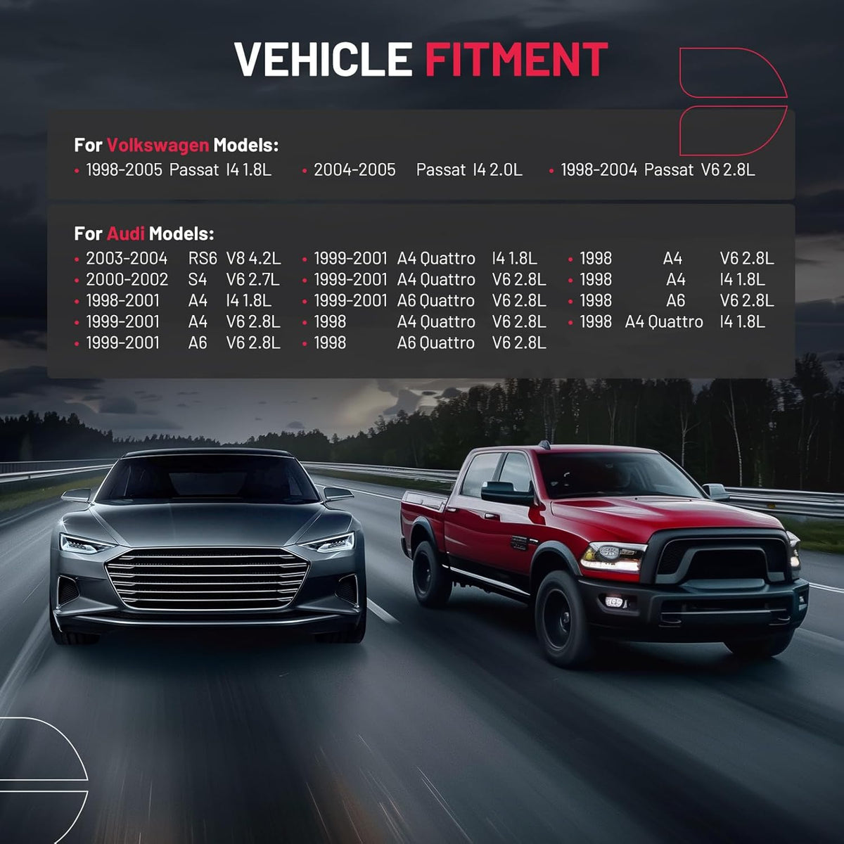 【Precautions】Please confirm compatibility based on your vehicle's year, brand, model, and the OE number of the replacement parts. Compatible with VW 1998-2005 Passat l4 1.8L; Compatible with Audi 2003-2004 RS6 V8 4.2L, 2000-2002 S4 V6 2.7L, 1999-2001 A4 Quattro l4 1.8L, 1999-2001 A6 Quattro V6 2.8L.etc. More information can be found in the pictures or on the details page.