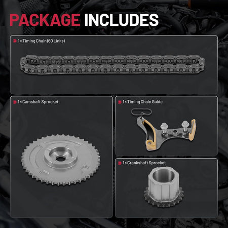 [Package Includes]: 1 x Timing Chain(60 Links), 1 x Camshaft Sprocket, 1 x Crankshaft Sprocket, 1 x Timing Chain Guide.