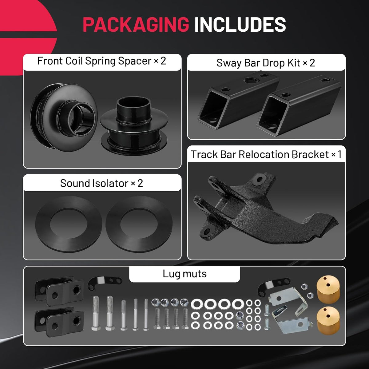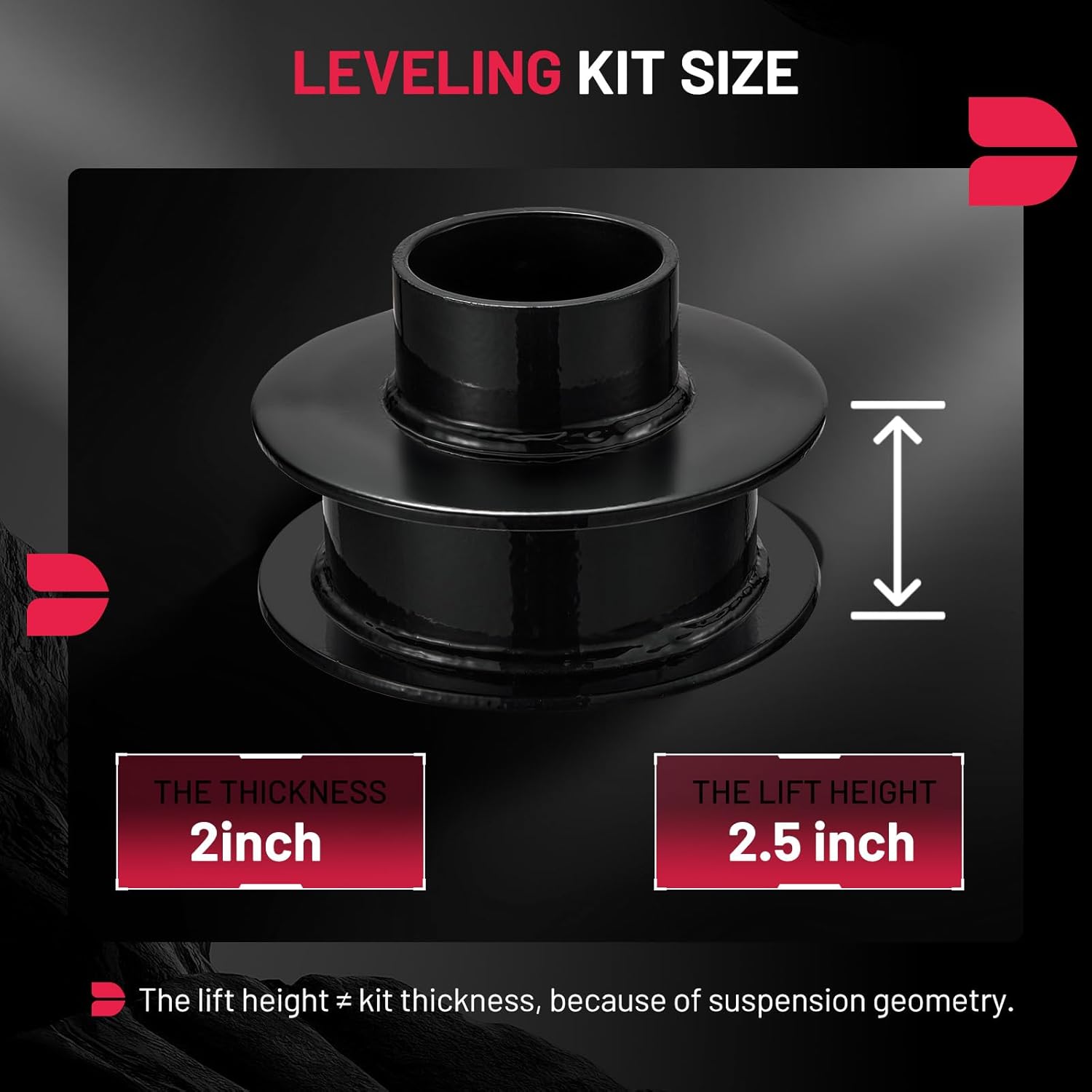 【PRODUCT USAGE】The road surface is uneven when driving a car.The 2.5 inch lift kit is designed to increase the factory front camber of the vehicle, keeping the vehicle level front to back. Increase the distance between the frame and the ground to make your driving easier and more enjoyable.