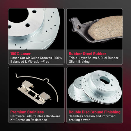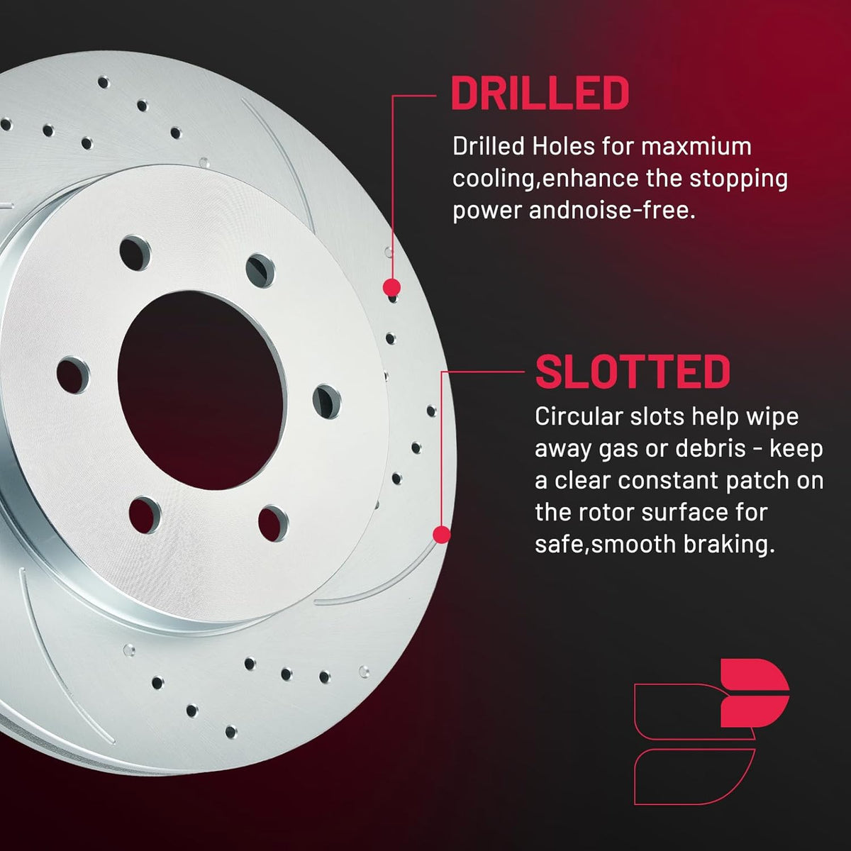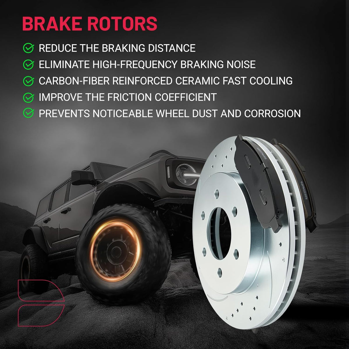 【Braking Excellence】: This brake pad and brake rotor kit includes premium OE replacement rotors, drilled and slotted performance for maximum cooling, enhance the stopping power, paired with carbon ceramic brake pads. High wear resistance and high temperature resistance, delivers braking for dependable stopping power.