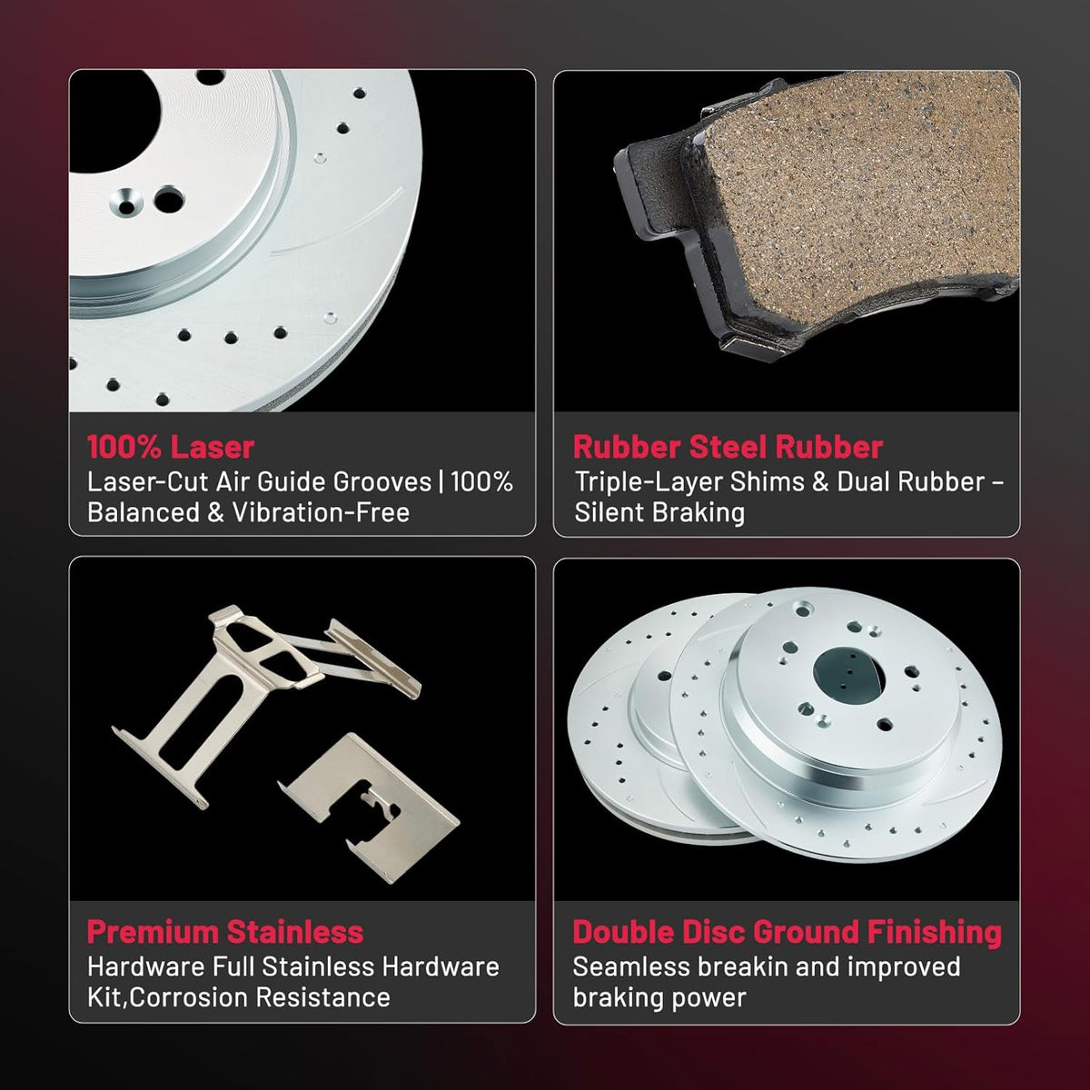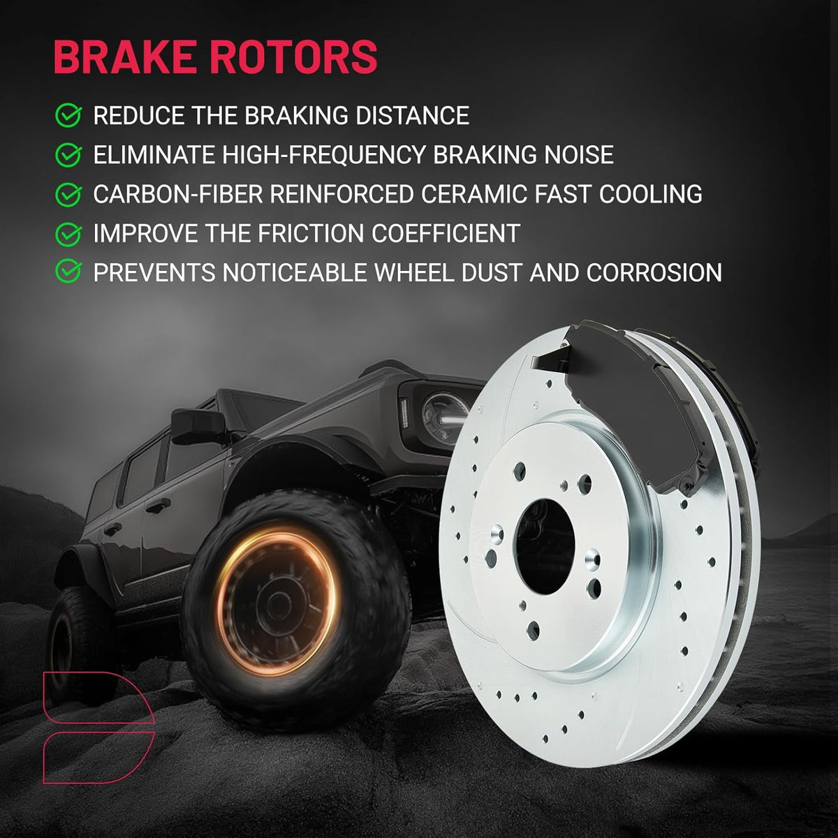【Braking Excellence】: This brake pad and brake rotor kit includes premium OE replacement rotors, drilled and slotted performance for maximum cooling, enhance the stopping power, paired with carbon ceramic brake pads. High wear resistance and high temperature resistance, delivers braking for dependable stopping power.