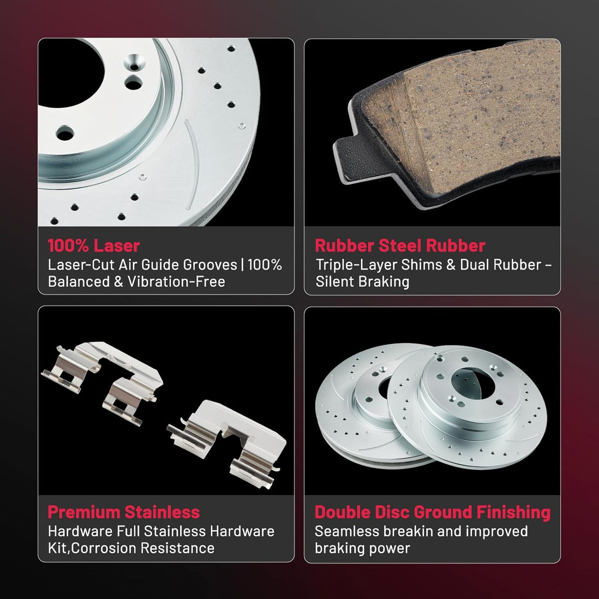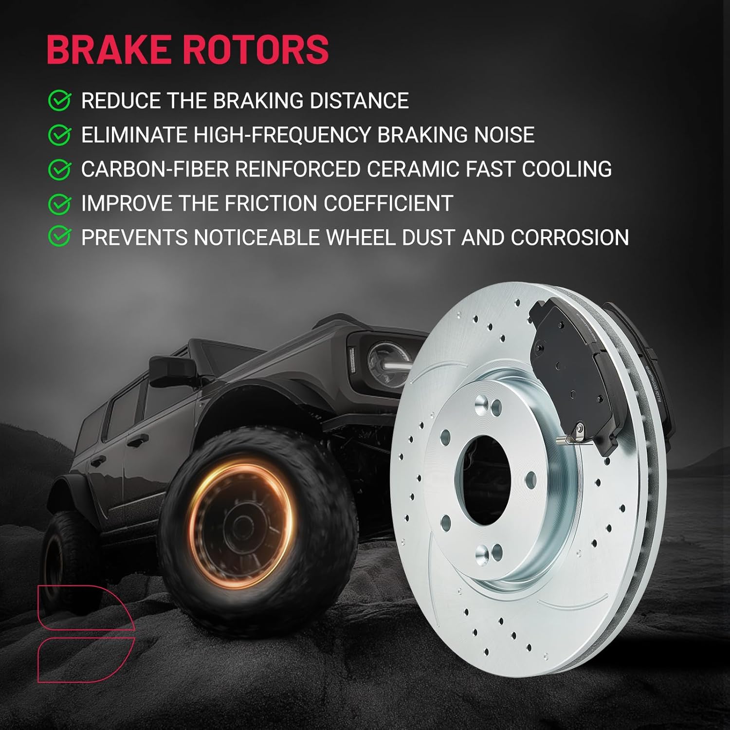 【Braking Excellence】: This brake pad and brake rotor kit includes premium OE replacement rotors, drilled and slotted performance for maximum cooling, enhance the stopping power, paired with carbon ceramic brake pads. High wear resistance and high temperature resistance, delivers braking for dependable stopping power.