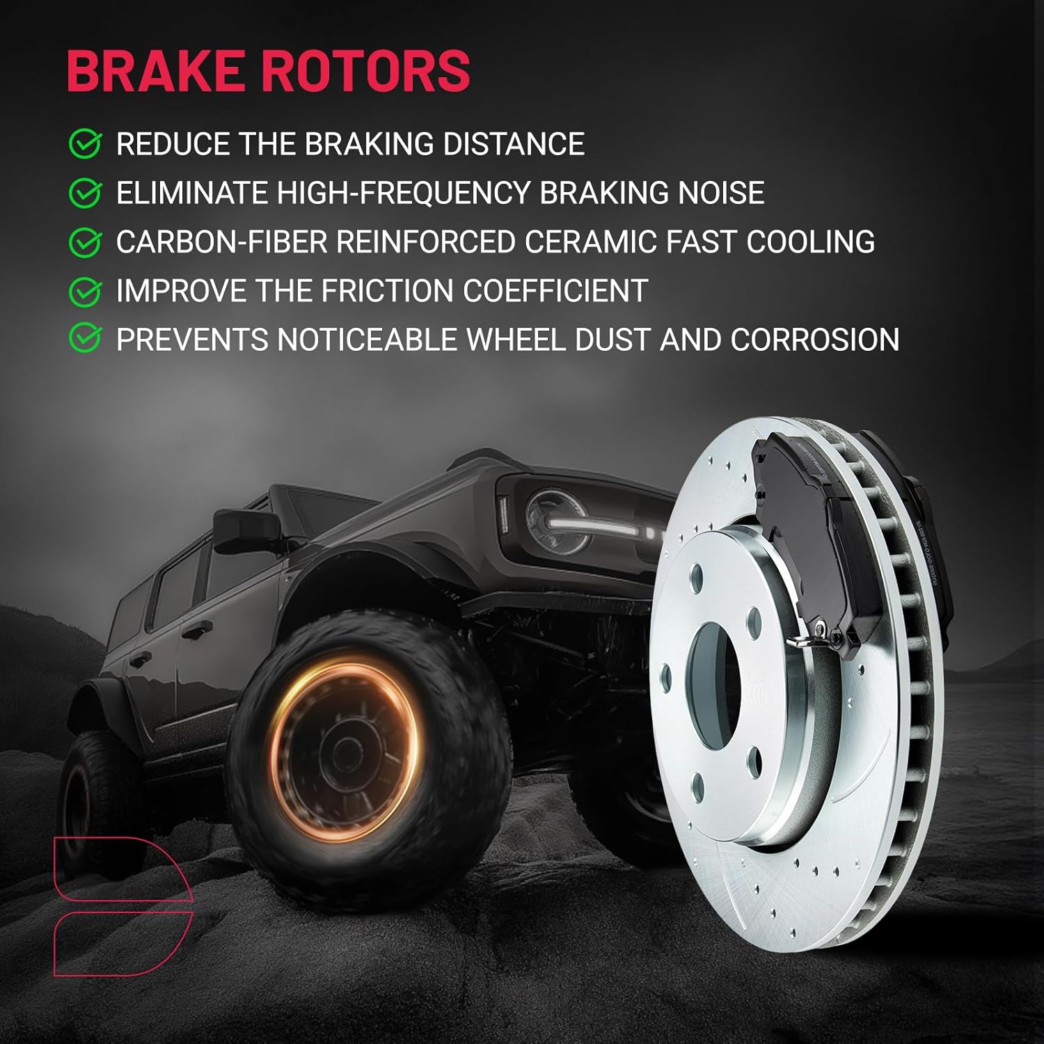 【Braking Excellence】: This brake pad and brake rotor kit includes premium OE replacement rotors, drilled and slotted performance for maximum cooling, enhance the stopping power, paired with carbon ceramic brake pads. High wear resistance and high temperature resistance, delivers braking for dependable stopping power.