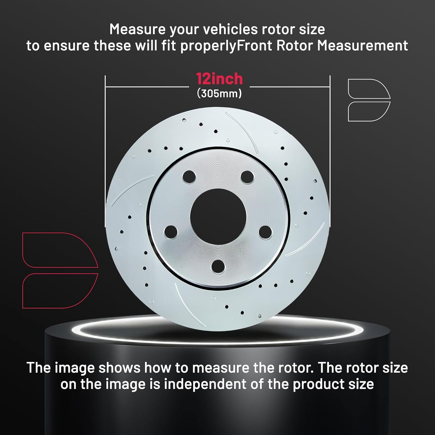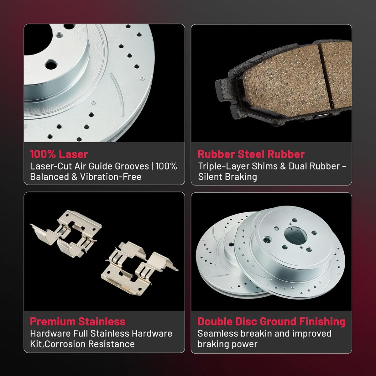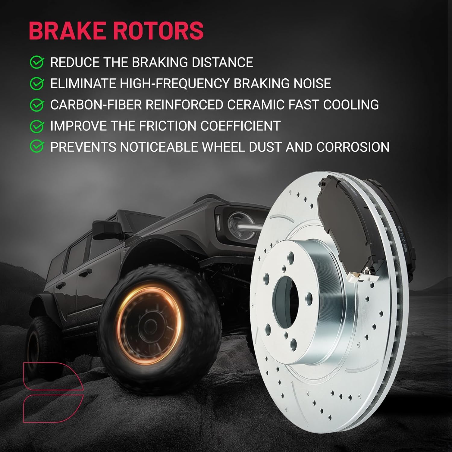 【Braking Excellence】: This brake pad and brake rotor kit includes premium OE replacement rotors, drilled and slotted performance for maximum cooling, enhance the stopping power, paired with carbon ceramic brake pads. High wear resistance and high temperature resistance, delivers braking for dependable stopping power.