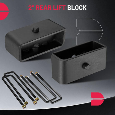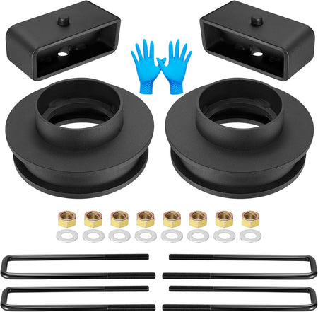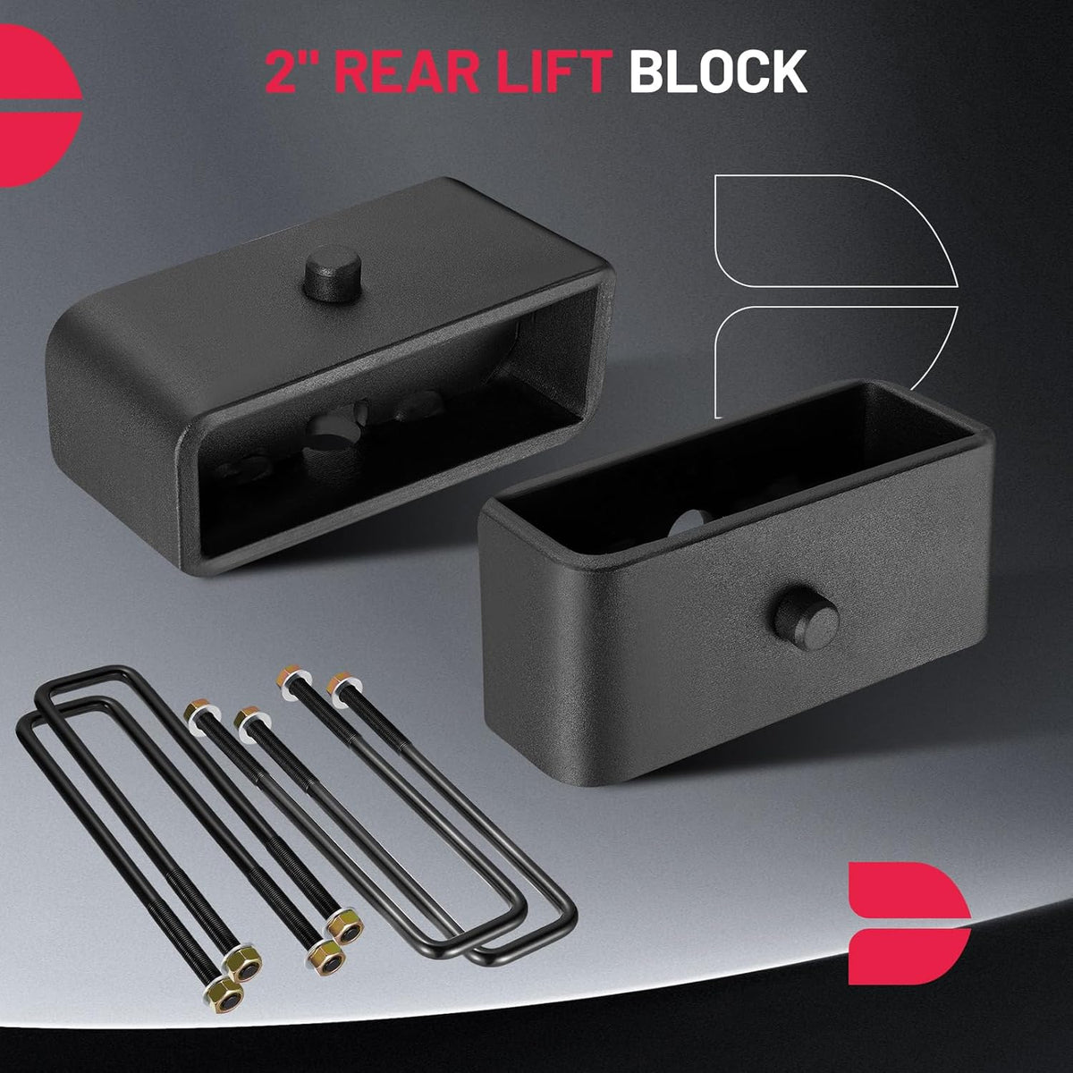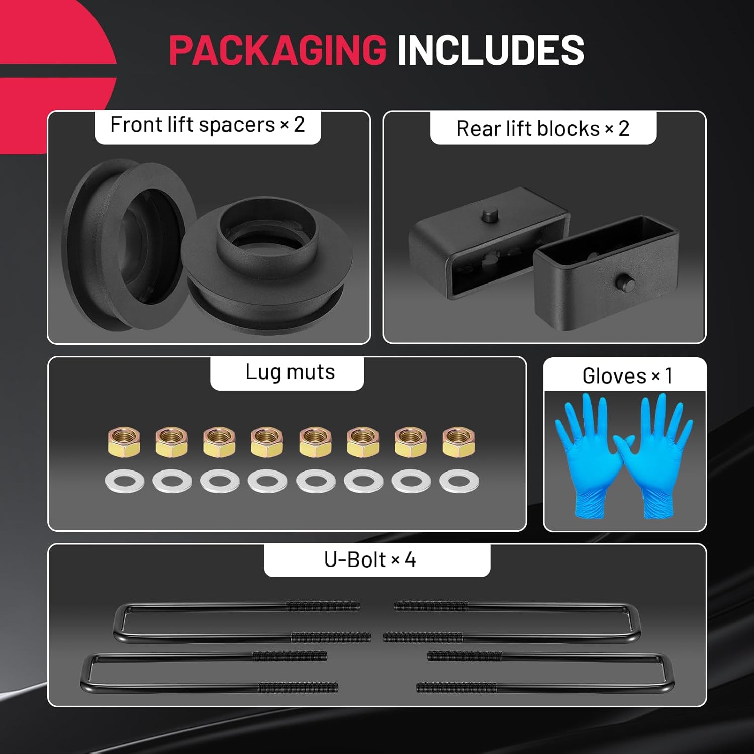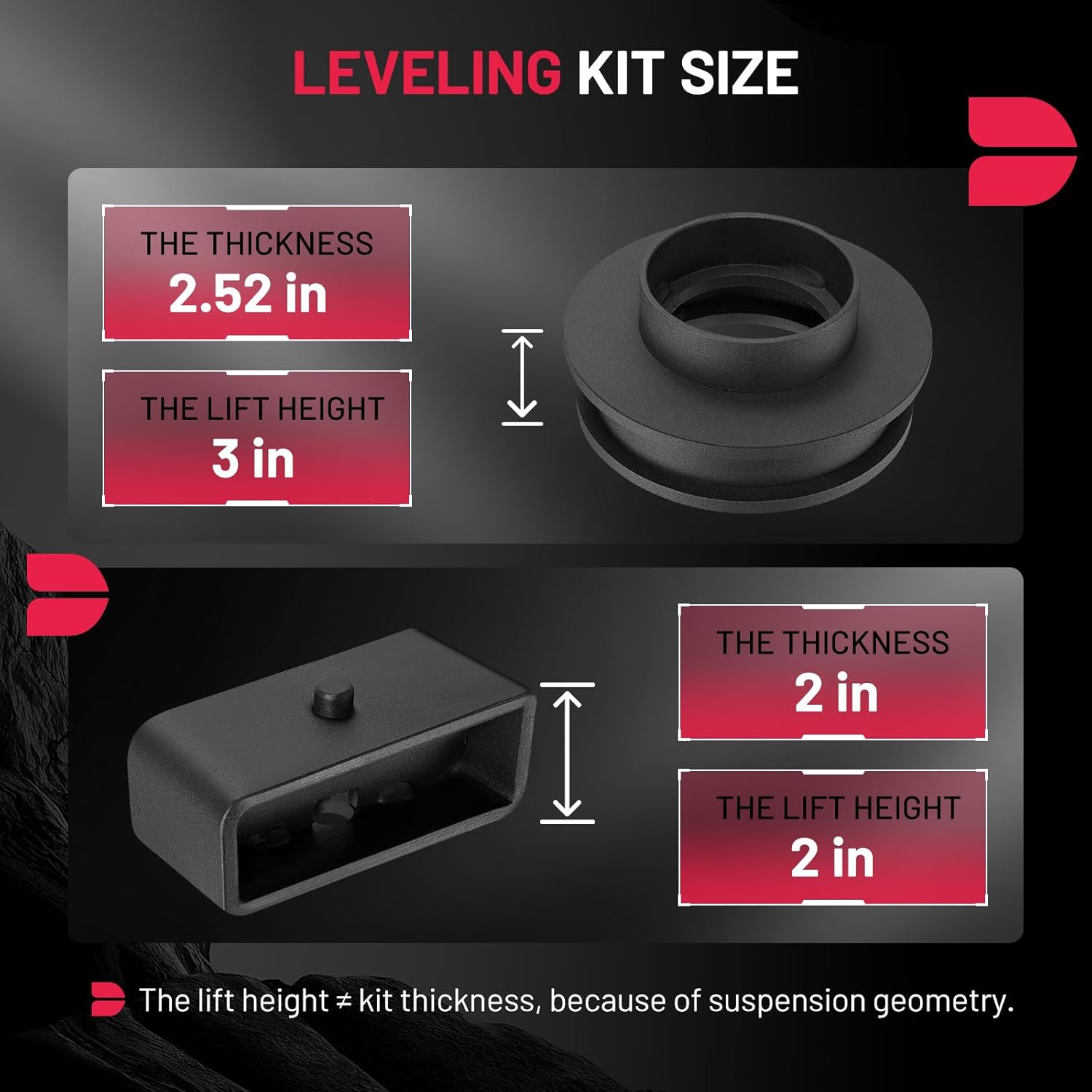 【Function】Improves the look of your vehicle and provides additional fender clearance for larger tires and wheels. With your truck's newly added height, your undercarriage will be a lot safer from damaging road obstacles. Note: The thickness of the front lift kit is 2.52", it will raise 3" at the front; the thickness of the rear is 2", it will raise 2" at the rear. This is due to suspension geometry, the ratio of the front lifting height to the thickness of the lift kit is not 1:1.