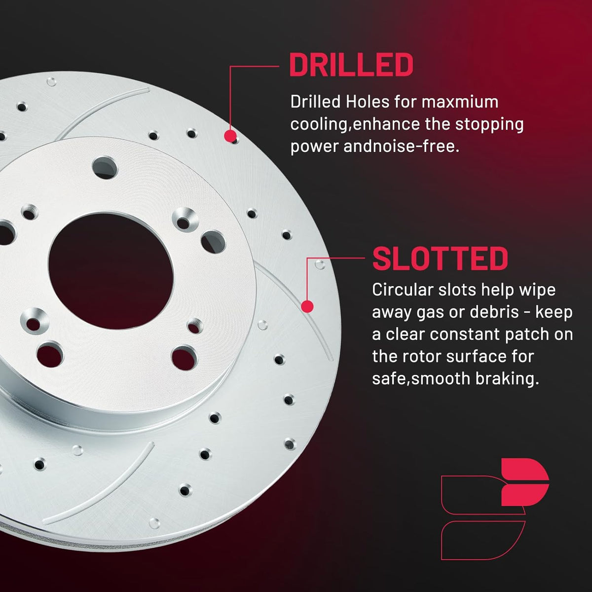 【Brake Kit Includes】: 1 x Front Drilled Slotted Brake Rotors, 1 x Front Ceramic Brake Pads, easy installation with no modifications required.