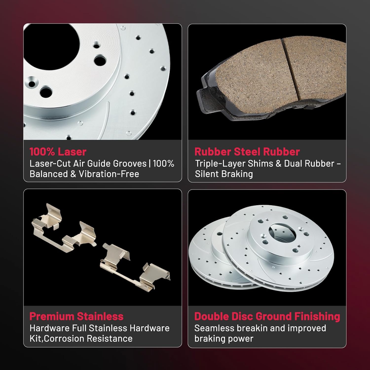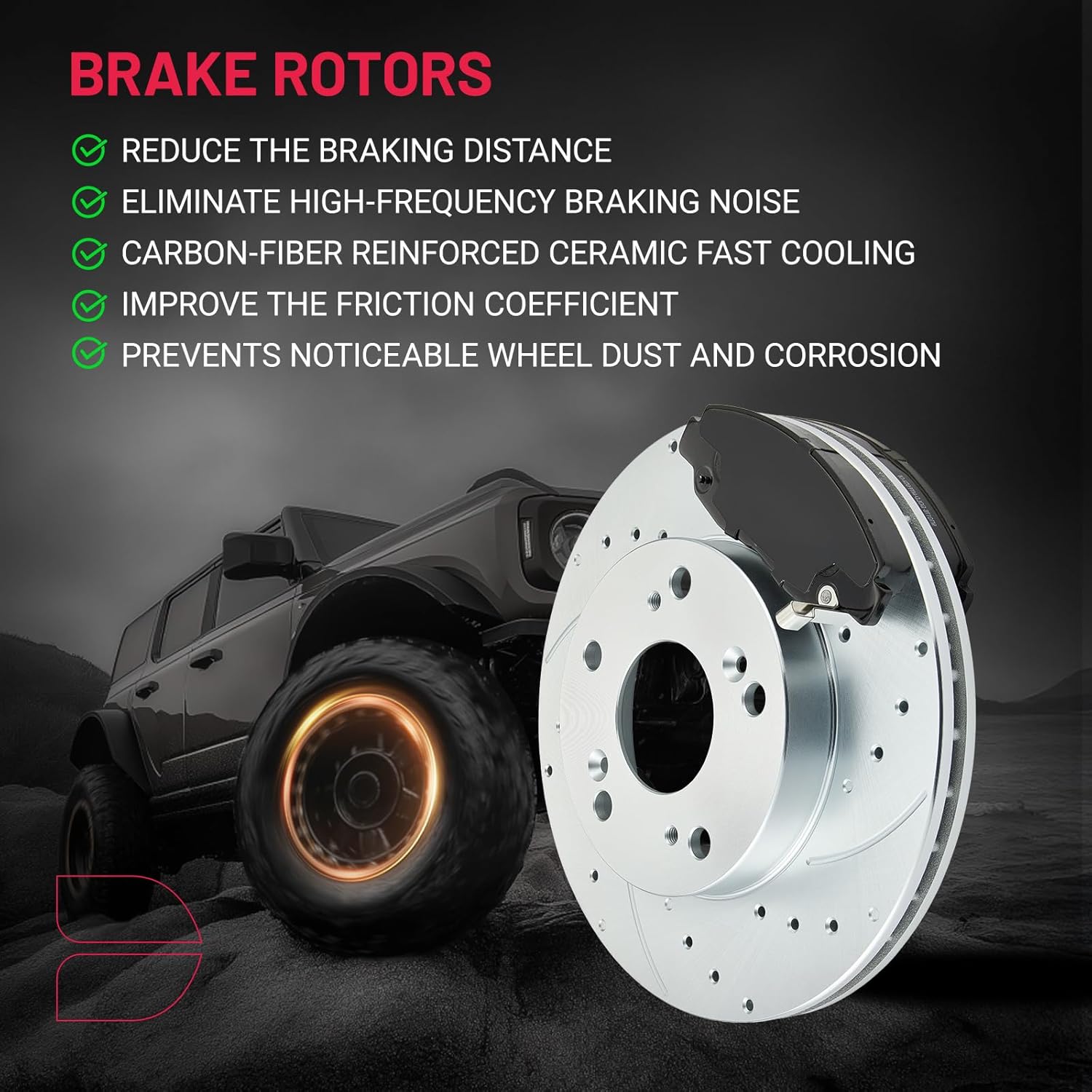 【Braking Excellence】: This brake pad and brake rotor kit includes premium OE replacement rotors, drilled and slotted performance for maximum cooling, enhance the stopping power, paired with carbon ceramic brake pads. High wear resistance and high temperature resistance, delivers braking for dependable stopping power.