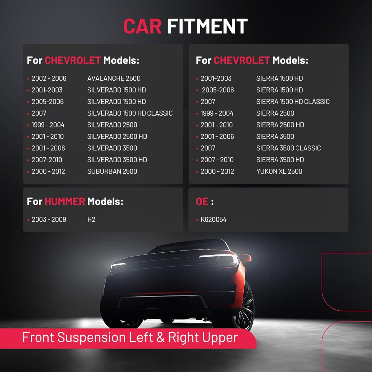 【Compatible with】 Compatible with Chevrolet Avalanche 2500 2002-2006, Silverado 1500HD 2001-2006, Silverado 1500HD Classic 2007, Silverado 2500 1999-2004, Silverado 2500HD 2001-2010, Silverado 3500 2001-2006, Silverado 3500HD 2007-2010, Suburban 2500 2000-2012; Compatible with GMC Sierra 1500HD 2001-2006, Sierra 1500HD Classic 2007, Sierra 2500 1999-2004, Sierra 2500HD 2001-2010, Sierra 3500 2001-2006, Sierra 3500HD 2007-2010, Yukon XL 2500 2000-2012; Compatible with Hummer H2 2003-2009
